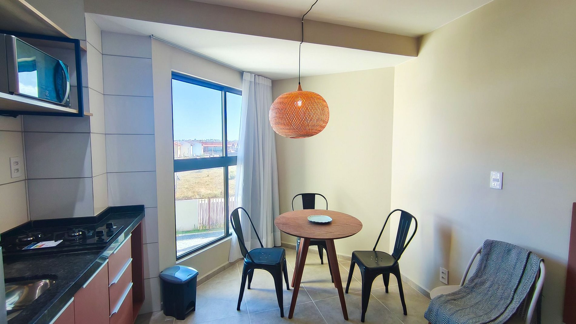 Cozinha - Equipada com fogão cooktop, geladeira, micro-ondas, panelas, louças, copos, talheres e diversos utensílios.