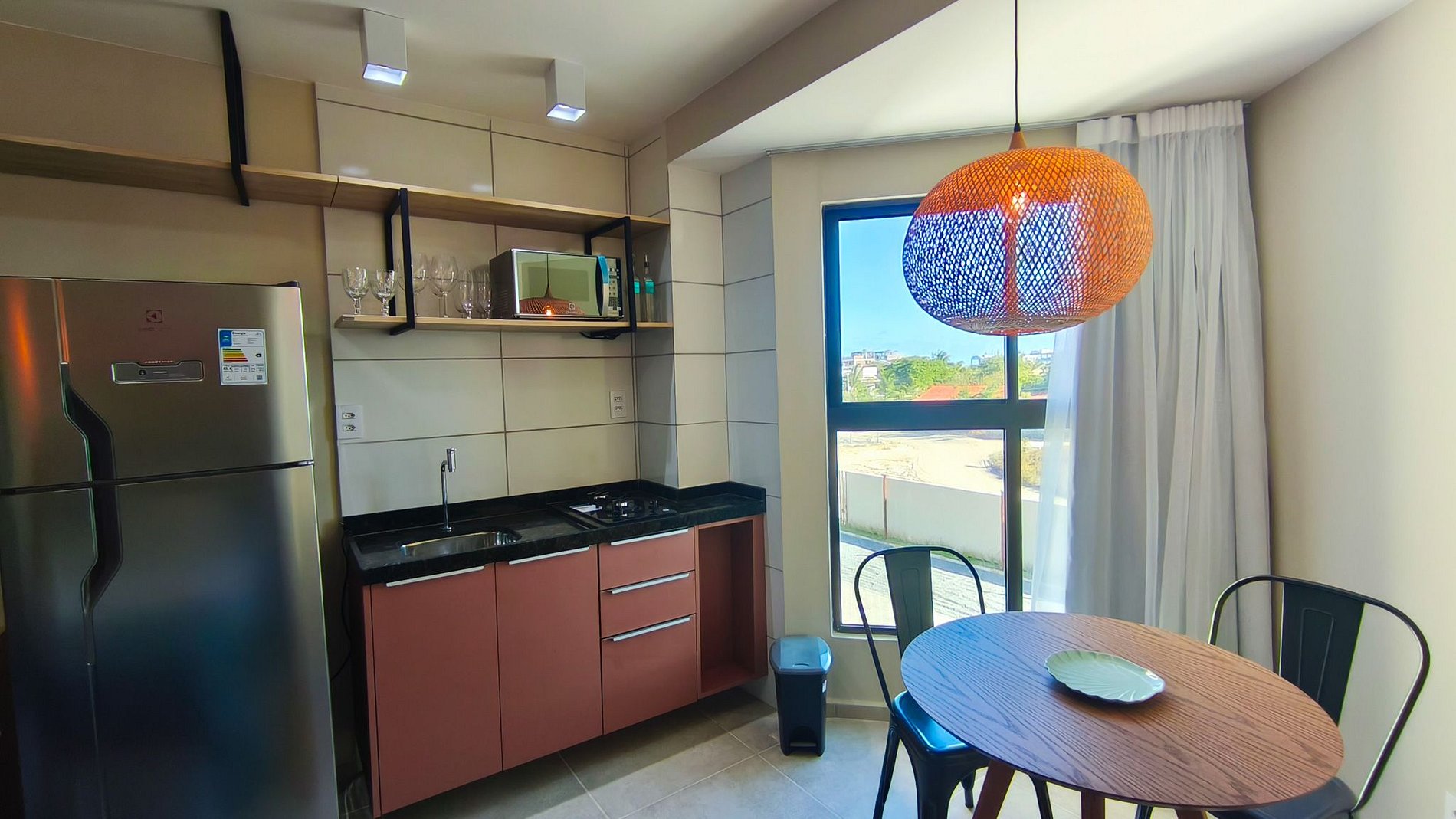 O ambiente conta com decoração moderna e possui TV e ar-condicionado. A cozinha é equipada com os principais utensílios como louça, copos, panelas, talheres, fogão cooktop, geladeira, micro-ondas e diversos utensílios. O flat possui 1 banheiro completo.