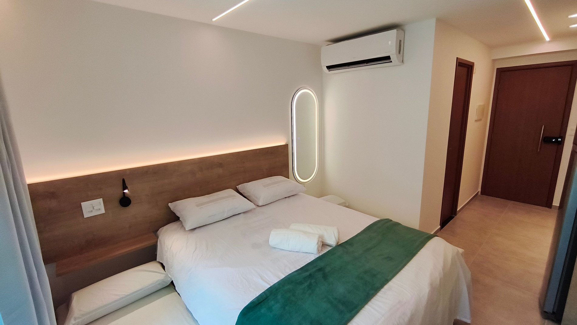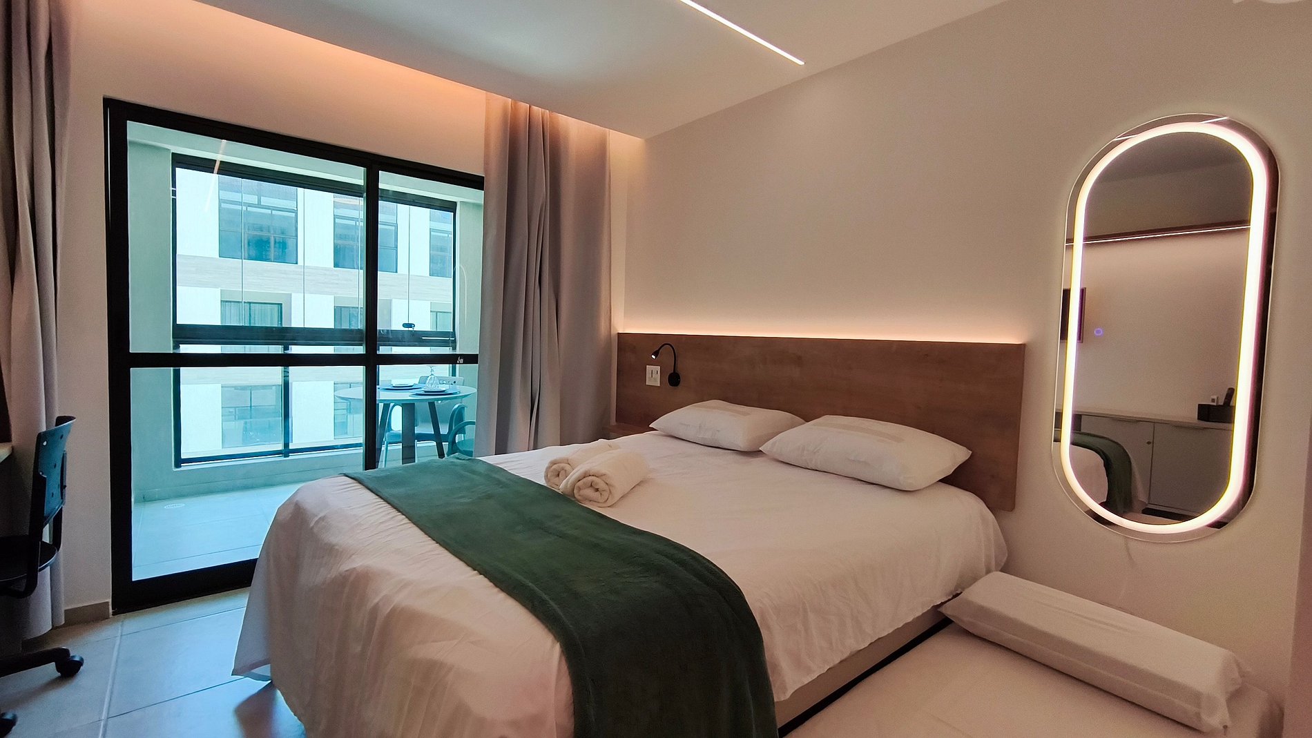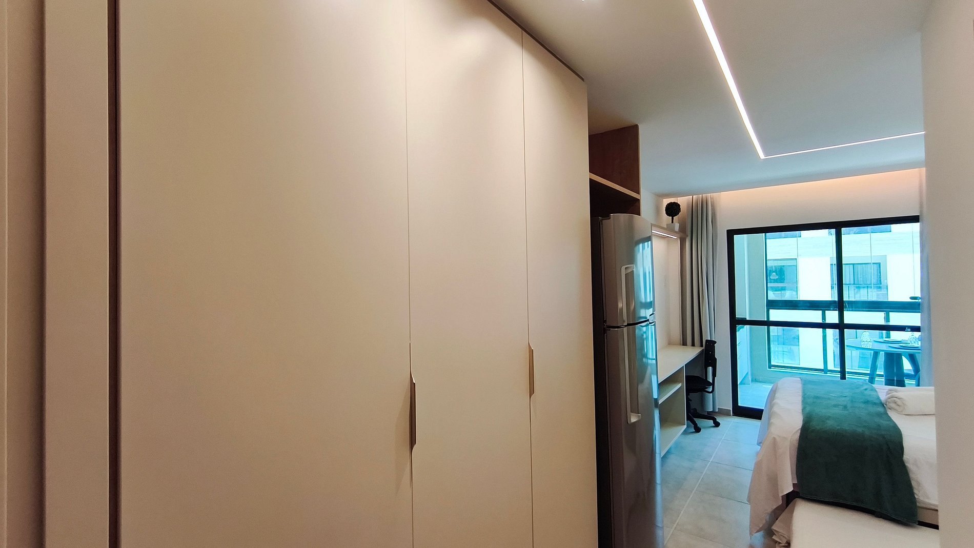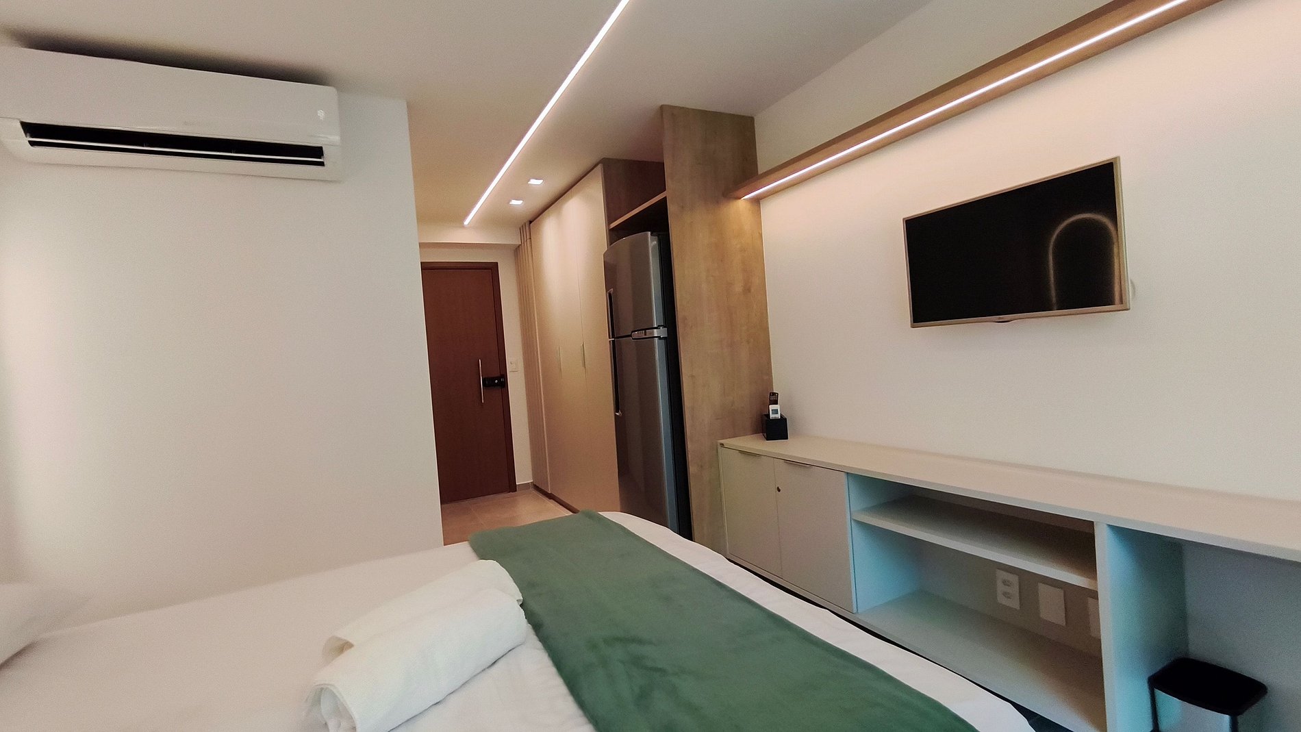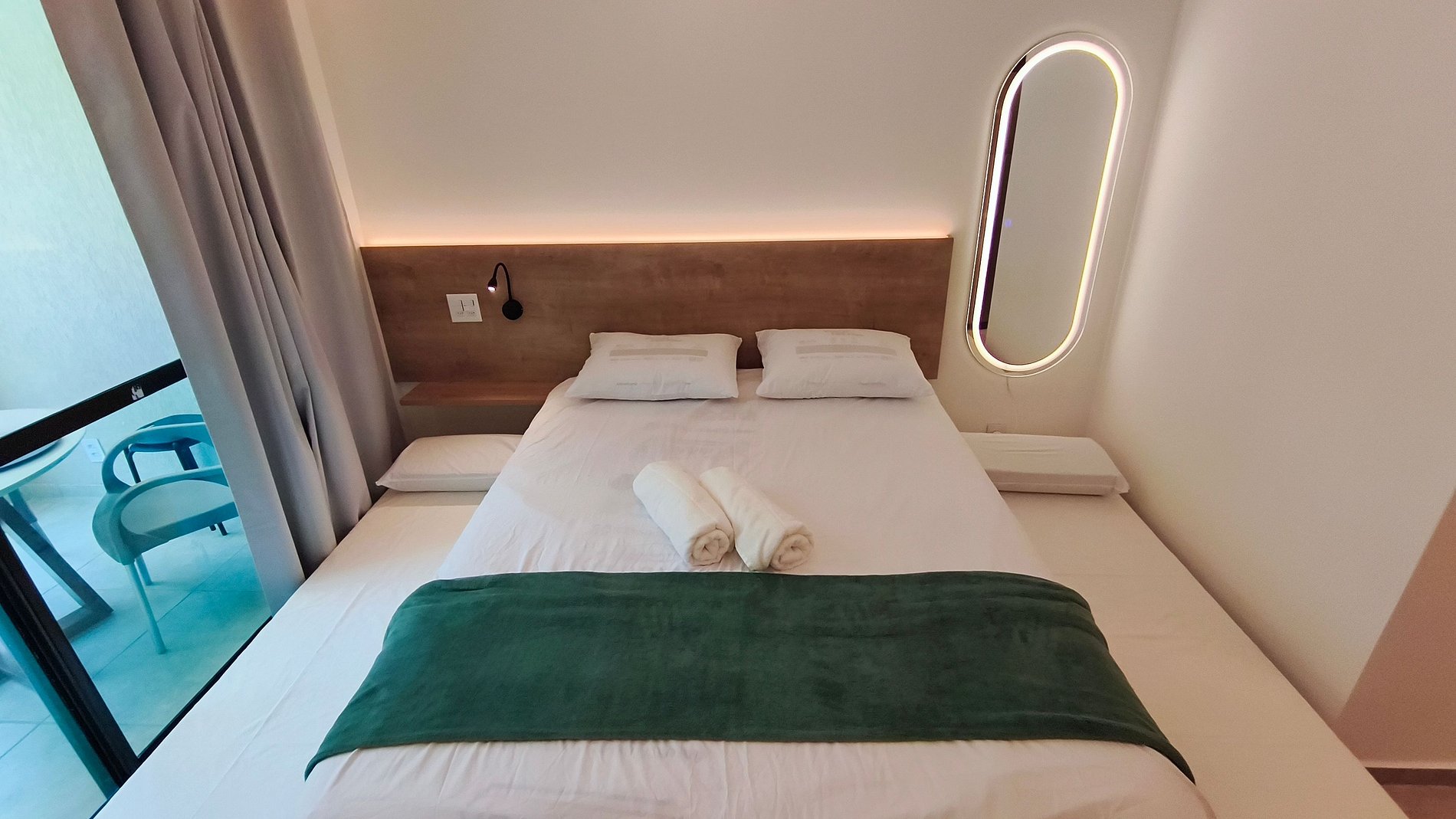 - Studio: 1 cama de casal + 2 bicamas solteiro, armário, TV e ar-condicionado.