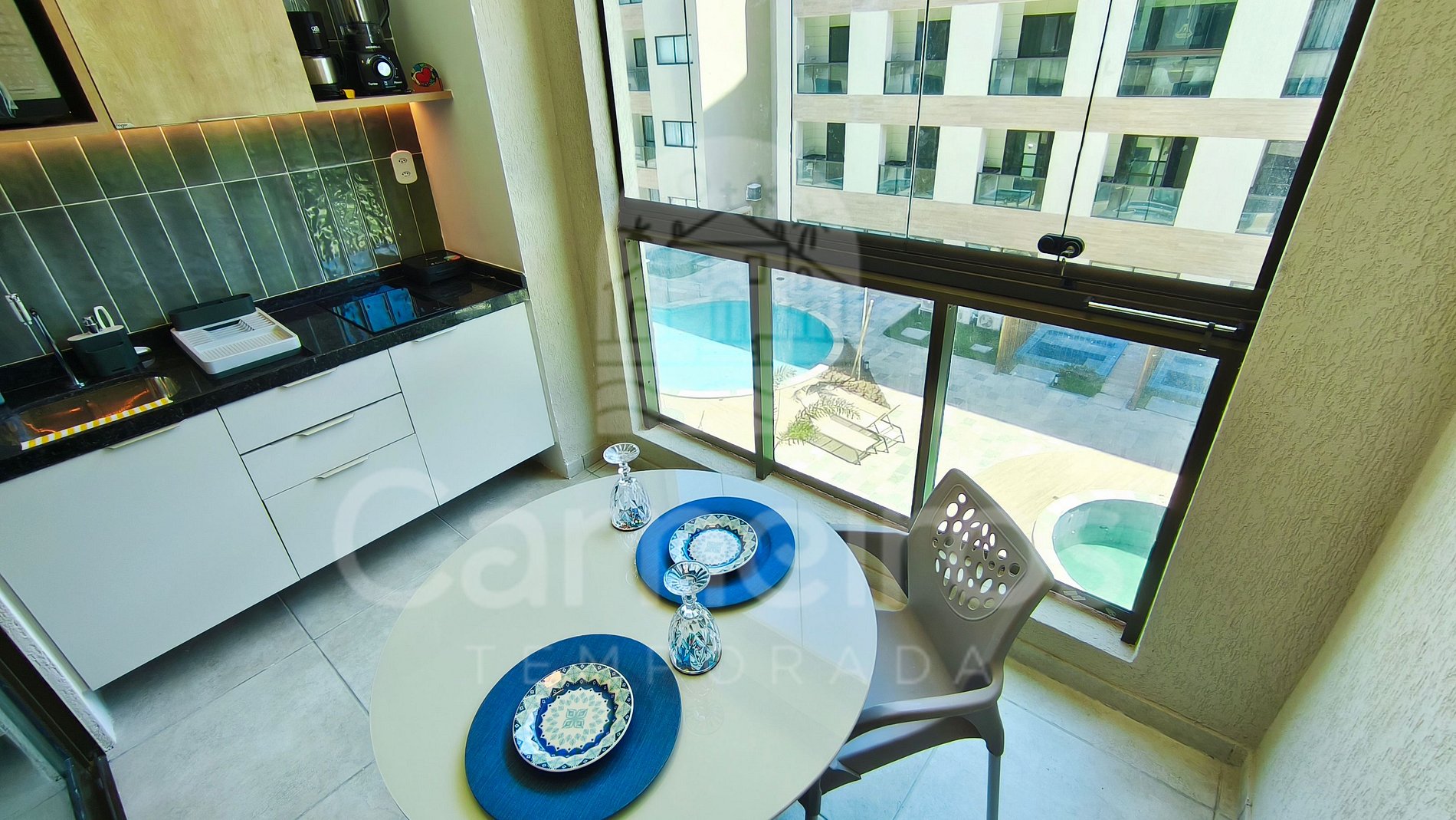 O imóvel oferece decoração contemporânea e é totalmente climatizado, garantindo conforto em qualquer estação. A varanda fechada com cortina de vidro proporciona uma vista incrível das piscinas, garantindo integração com a área externa sem abrir mão do conforto. Dispõe de internet de alta velocidade e TV por assinatura, além de um ambiente planejado com móveis sob medida e espaço para escritório, ideal para quem deseja unir lazer e praticidade.