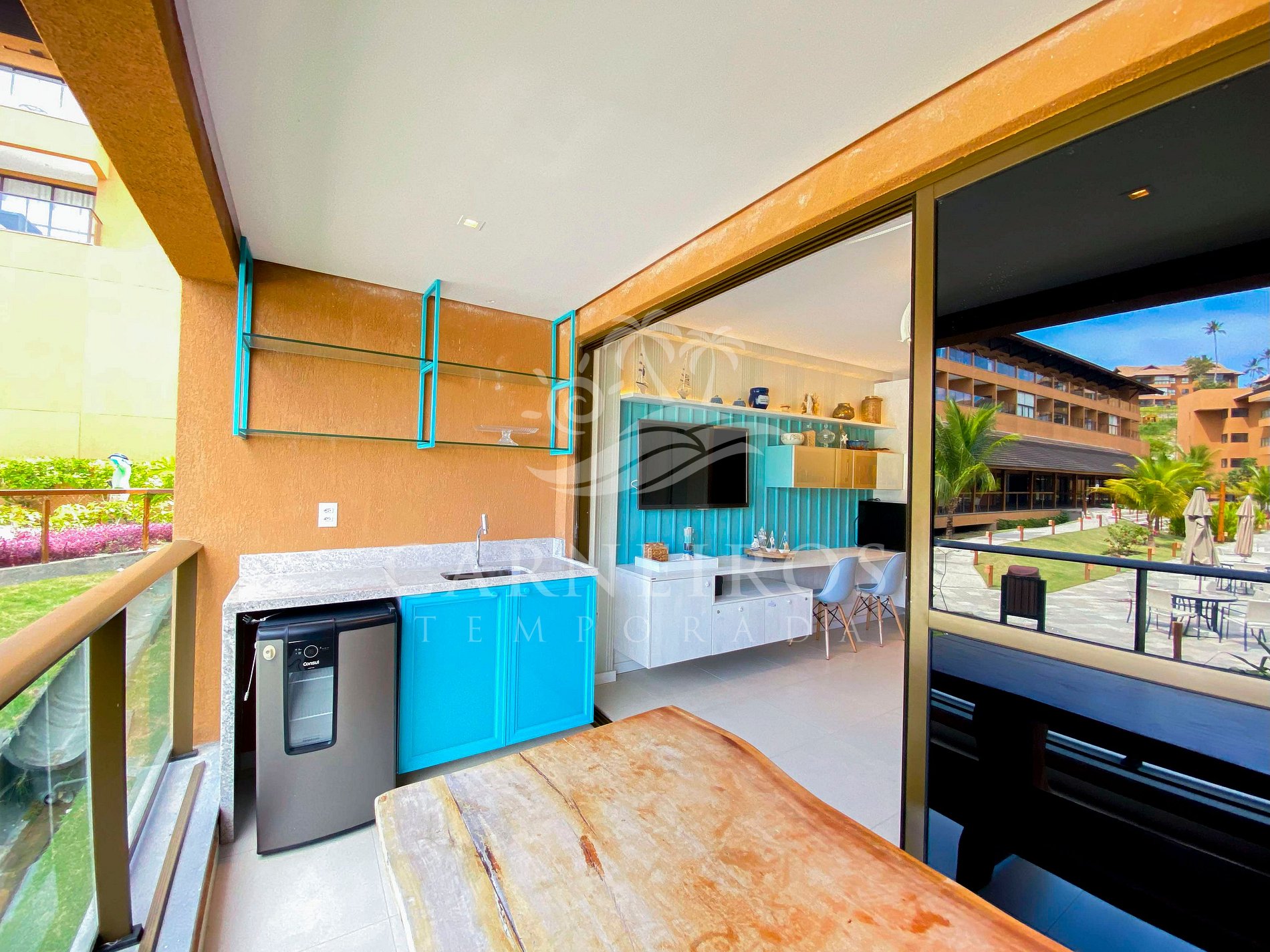 ✹ O flat se localiza no térreo, possui uma linda varanda com vista para a piscina, cervejeira, bancos e mesa ✹