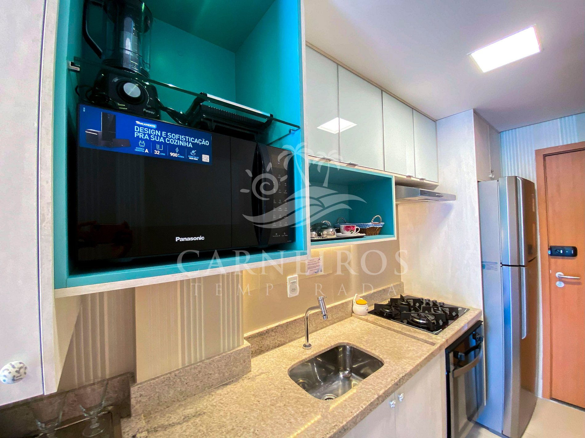 Na sala de estar, além da decoração agradável temos uma TV, sofá-cama de casal, adega, balcão com duas cadeiras e ar-condicionado. A cozinha é completa e possui diversos itens como micro-ondas, fogão cooktop com 04 bocas, forno, geladeira, bebedouro, sanduicheira, cafeteira, liquidificador, purificador de água e diversos utensílios. O flat possui 1 banheiro completo.