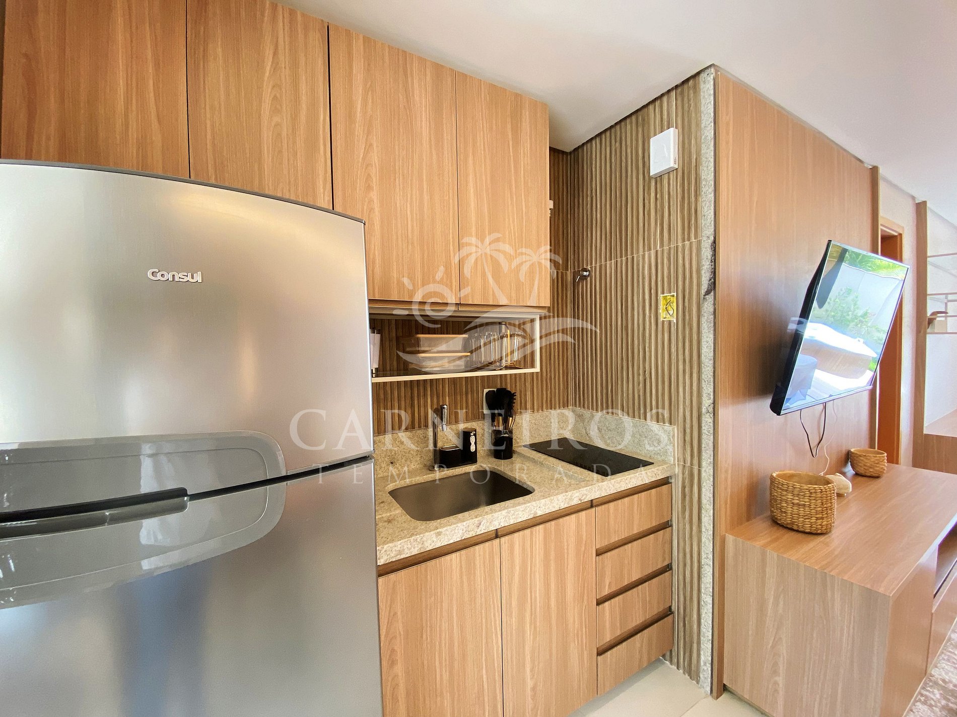 O ambiente integrado conta com sofá-cama, TV, ar-condicionado e cama de casal. A cozinha é equipada com louças, panelas, talheres, geladeira, fogão, micro-ondas e outros. Além disso, possui espaço para refeições com mesa e duas cadeiras e também um banheiro completo.