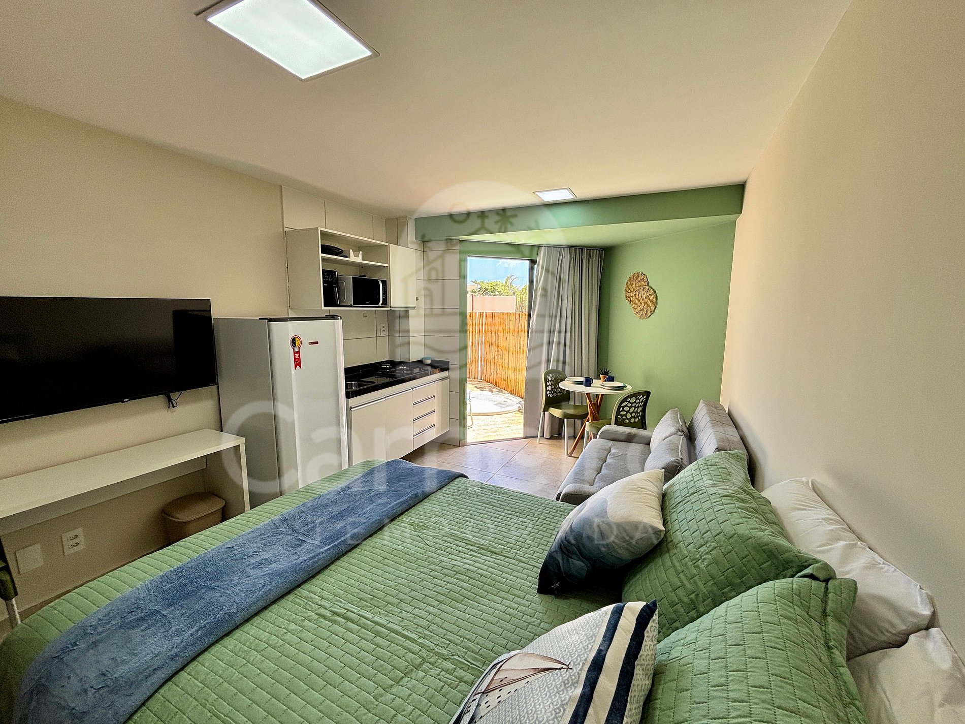 - Studio: 1 cama de casal + sofá cama, armário, TV e ar-condicionado.