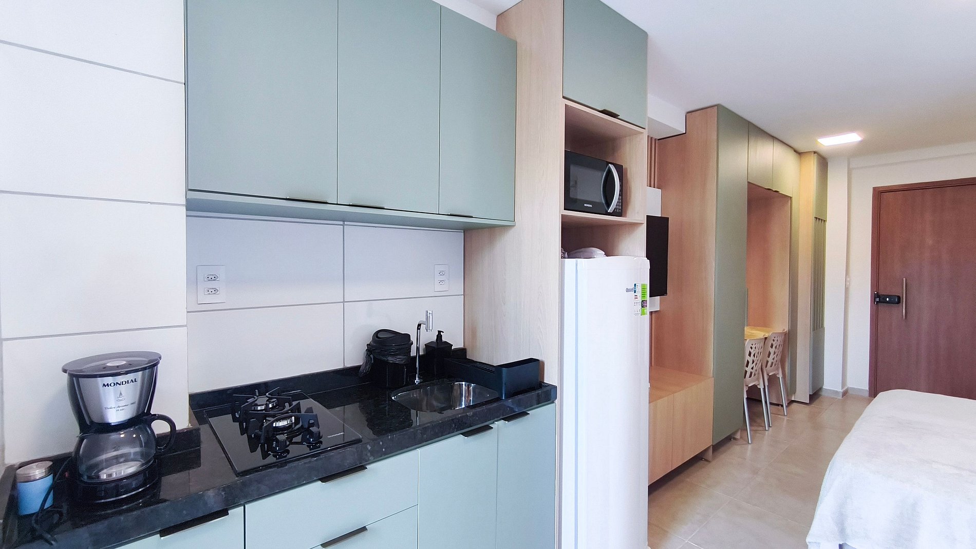 O flat possui banheiro privativo com água quente e uma cozinha completa, equipada com tudo que você precisa: louças, copos, panelas, talheres, ayrfrier, liquidificador, fogão cooktop, micro-ondas, cafeteira, geladeira e diversos utensílios para preparar suas refeições com comodidade.