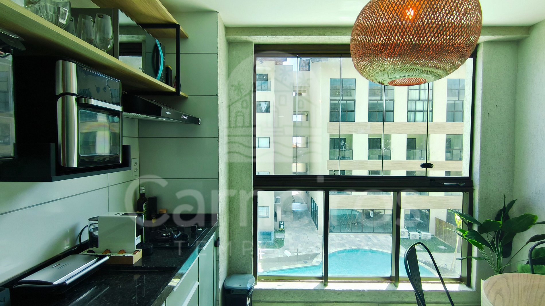 O ambiente conta com decoração moderna e possui TV e ar-condicionado. A cozinha é equipada com os principais utensílios como louça, copos, panelas, talheres, fogão cooktop, geladeira, micro-ondas, airfryer e diversos utensílios. O flat possui 1 banheiro completo.