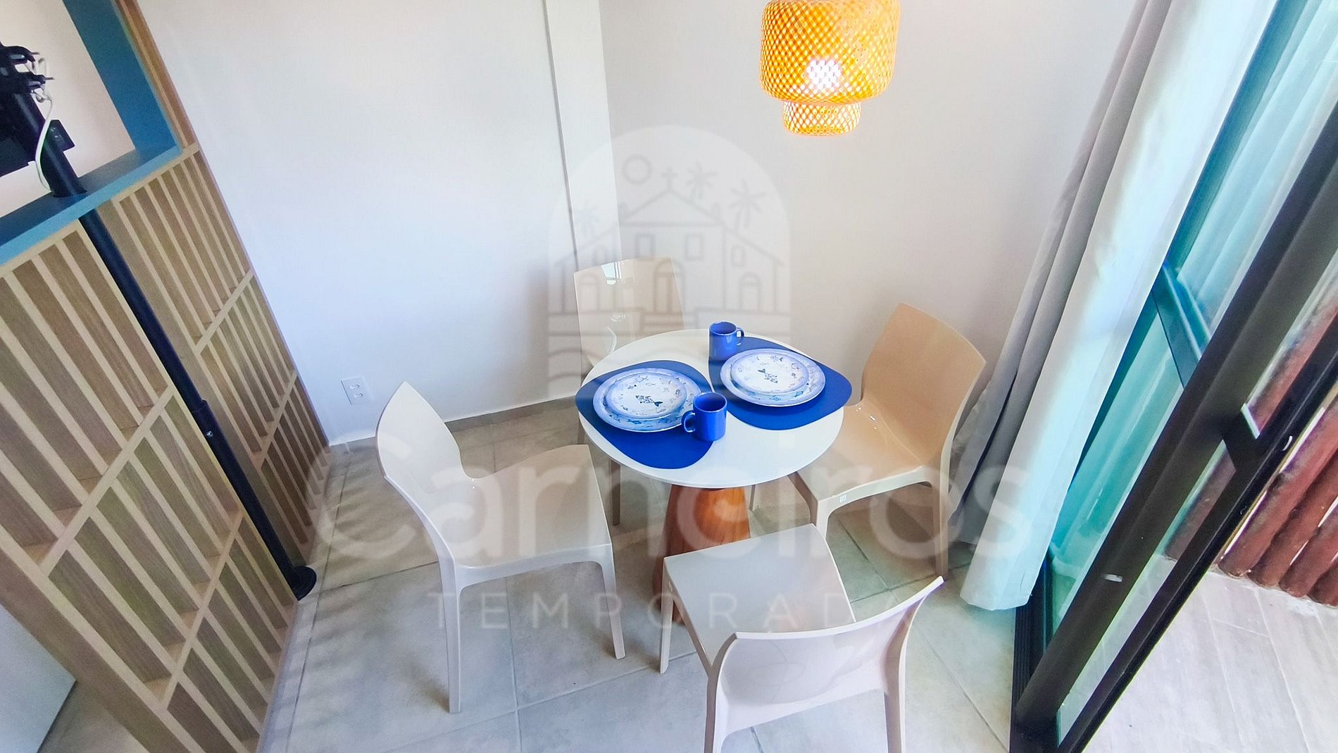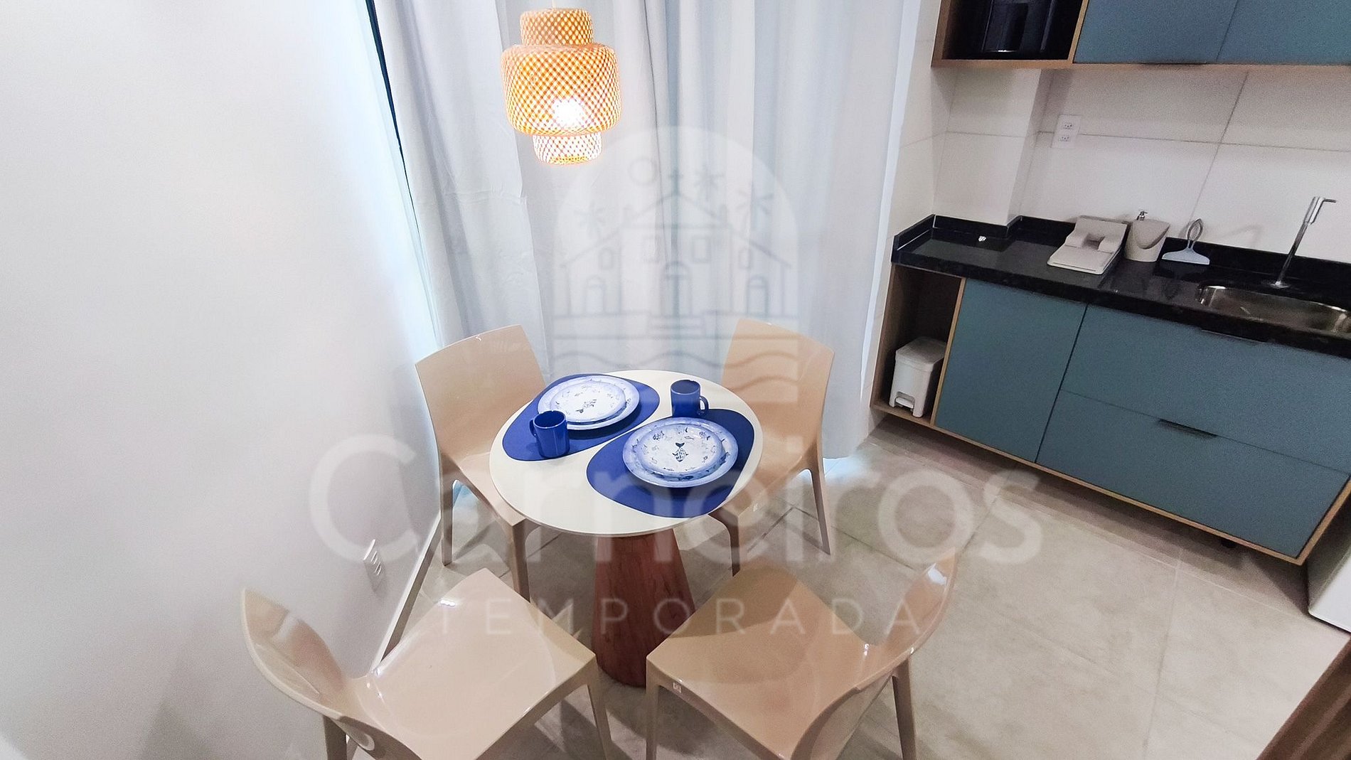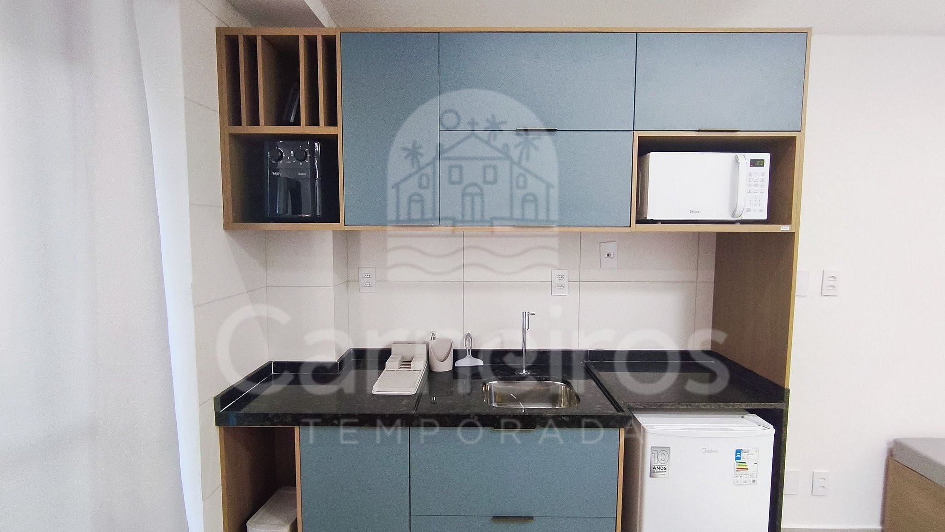 O ambiente conta com decoração moderna e possui TV, mesa, armário e ar-condicionado. A cozinha é equipada com os principais utensílios como louça, copos, panelas, talheres, liquidificador, sanduicheira, fogão de indução 1 boca, micro-ondas, frigobar, airfryer e diversos utensílios. O flat possui 1 banheiro completo.