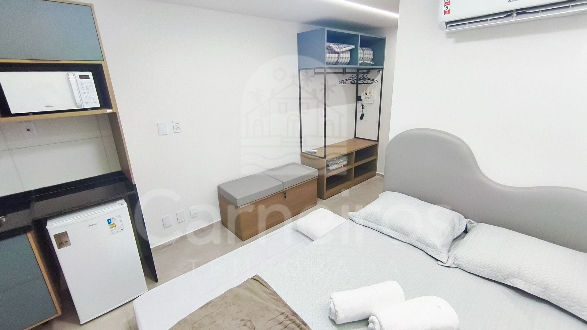 - Studio: 1 cama de casal Queen + 1 bicama de casal, armário, TV e ar-condicionado;