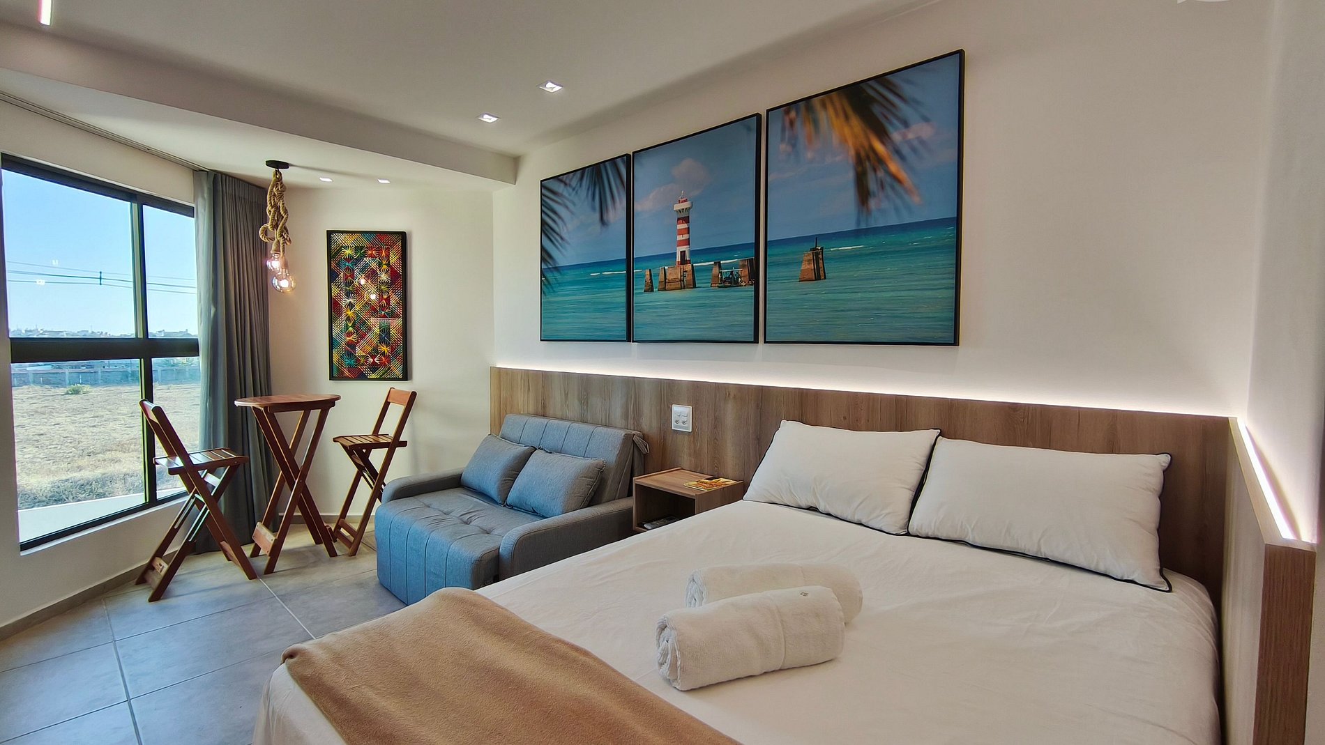 - Estúdio: 1 cama de casal + 1 sofá-cama casal, TV e ar-condicionado;