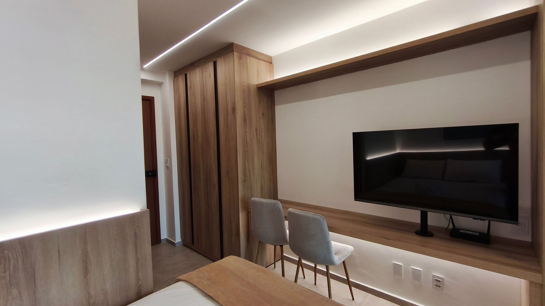 O estúdio possui decoração moderna e é equipado com TV (com serviço de Streaming), mesa, armário e ar-condicionado. A cozinha é completa, contando com louças, copos, panelas, talheres, liquidificador, sanduicheira, fogão, airfryer, micro-ondas entre outros utensílios. O espaço dispõe de um banheiro completo..