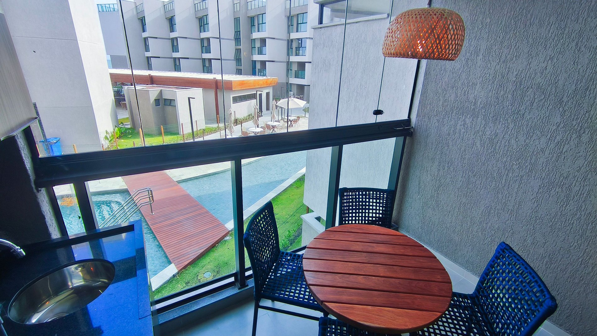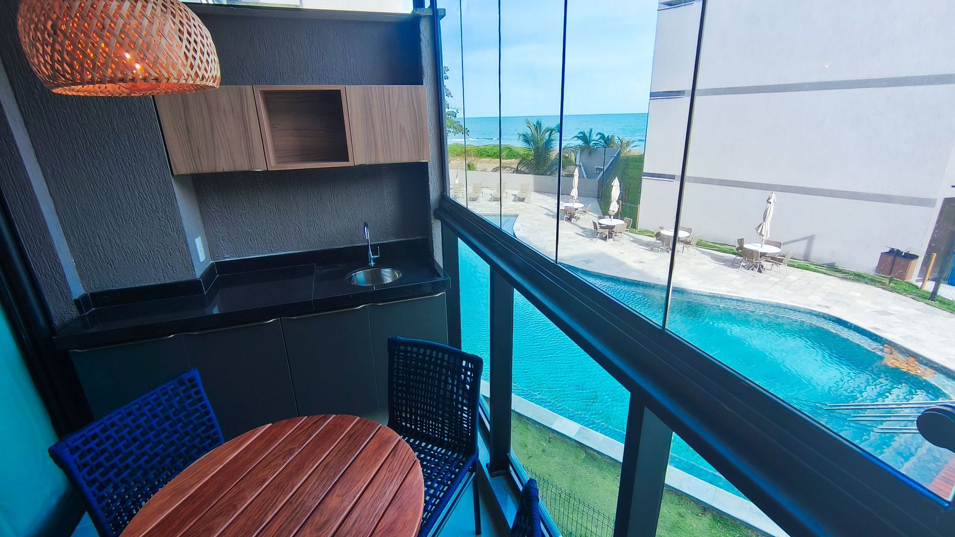 ✹O flat está localizado no primeiro andar, possui vista para a piscina e lateral para o mar e conta com uma aconchegante varanda com mesa e cadeiras ✹