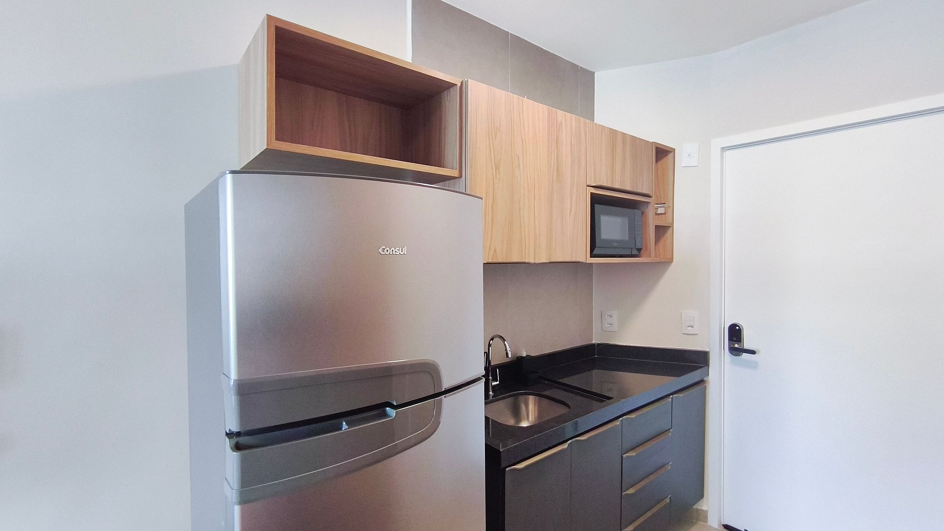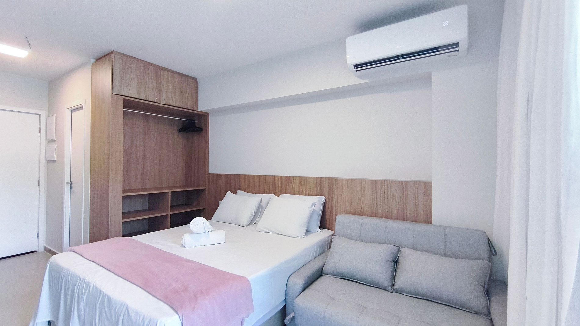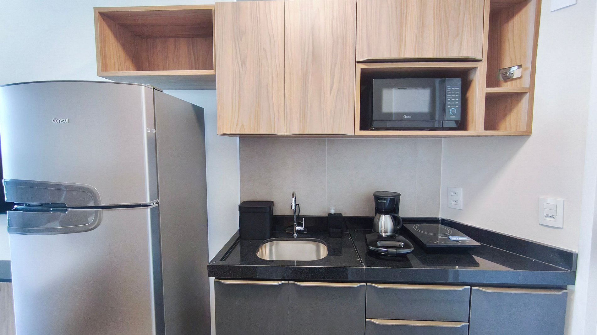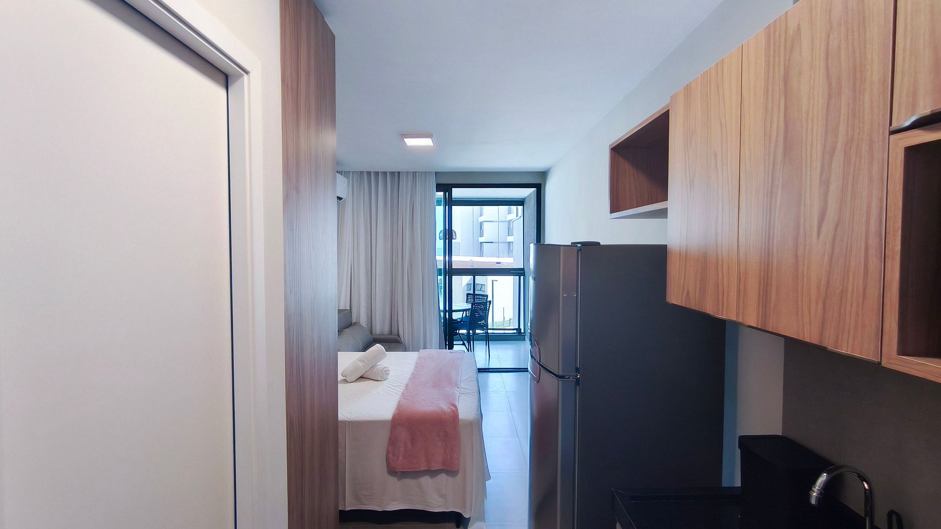 O ambiente integrado possui decoração aconchegante. O studio possui varanda, quarto, cozinha e banheiro. A cozinha é completa com geladeira, fogão, airfryer, sanduicheira, cafeteira elétrica, liquidificador, entre outros utensílios. O studio possui TV, ar condicionado e um banheiro completo. Há também varanda de frente para piscina e mesa para 4 lugares.