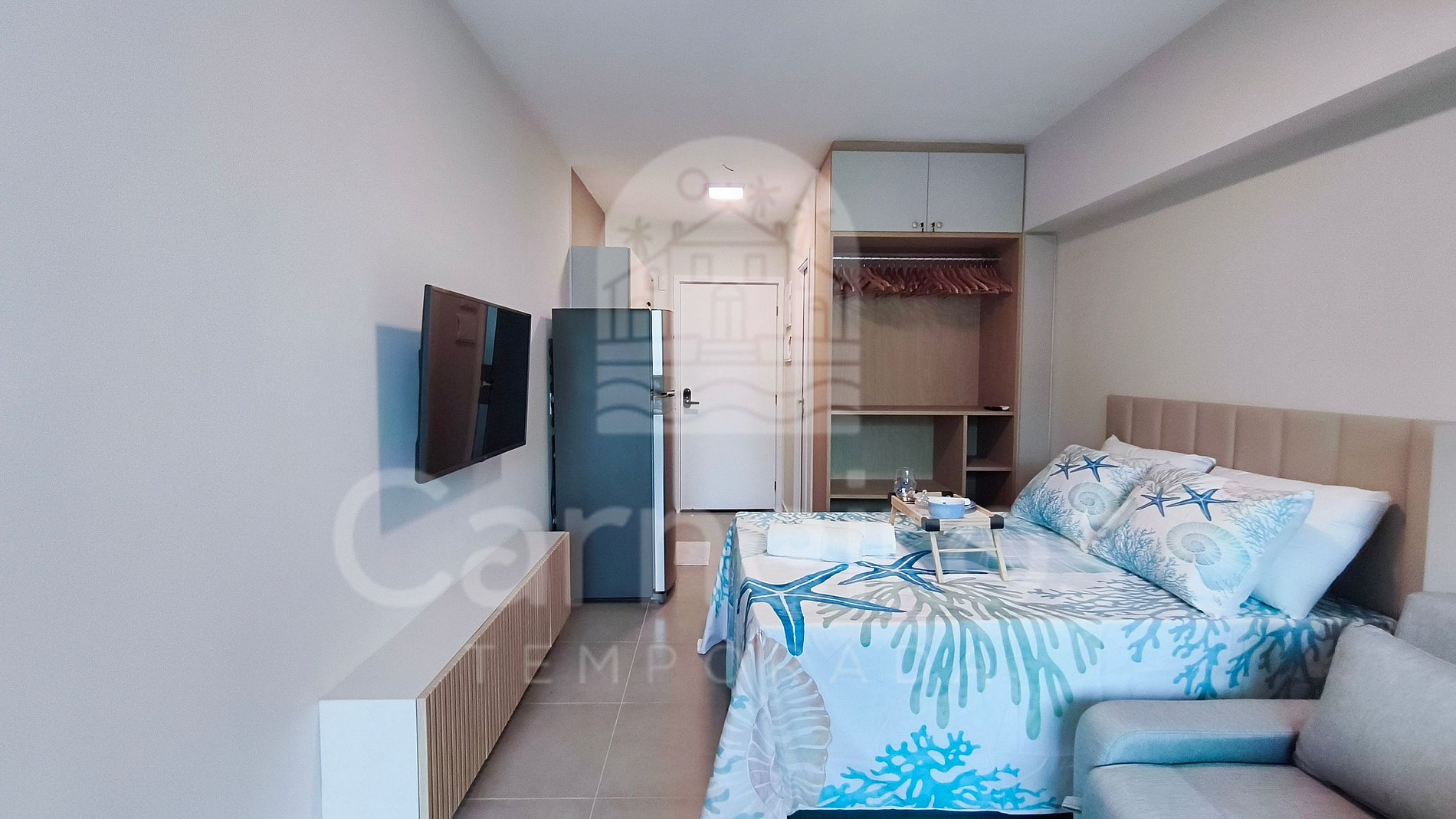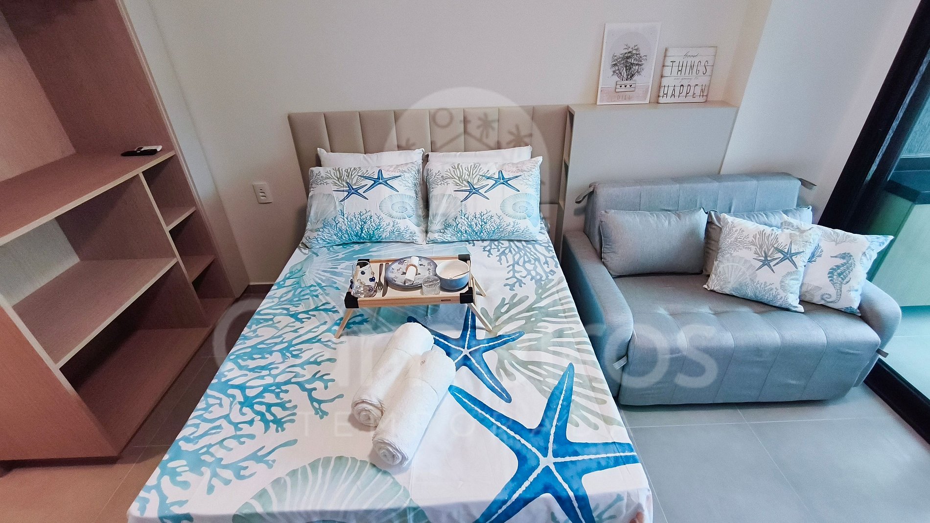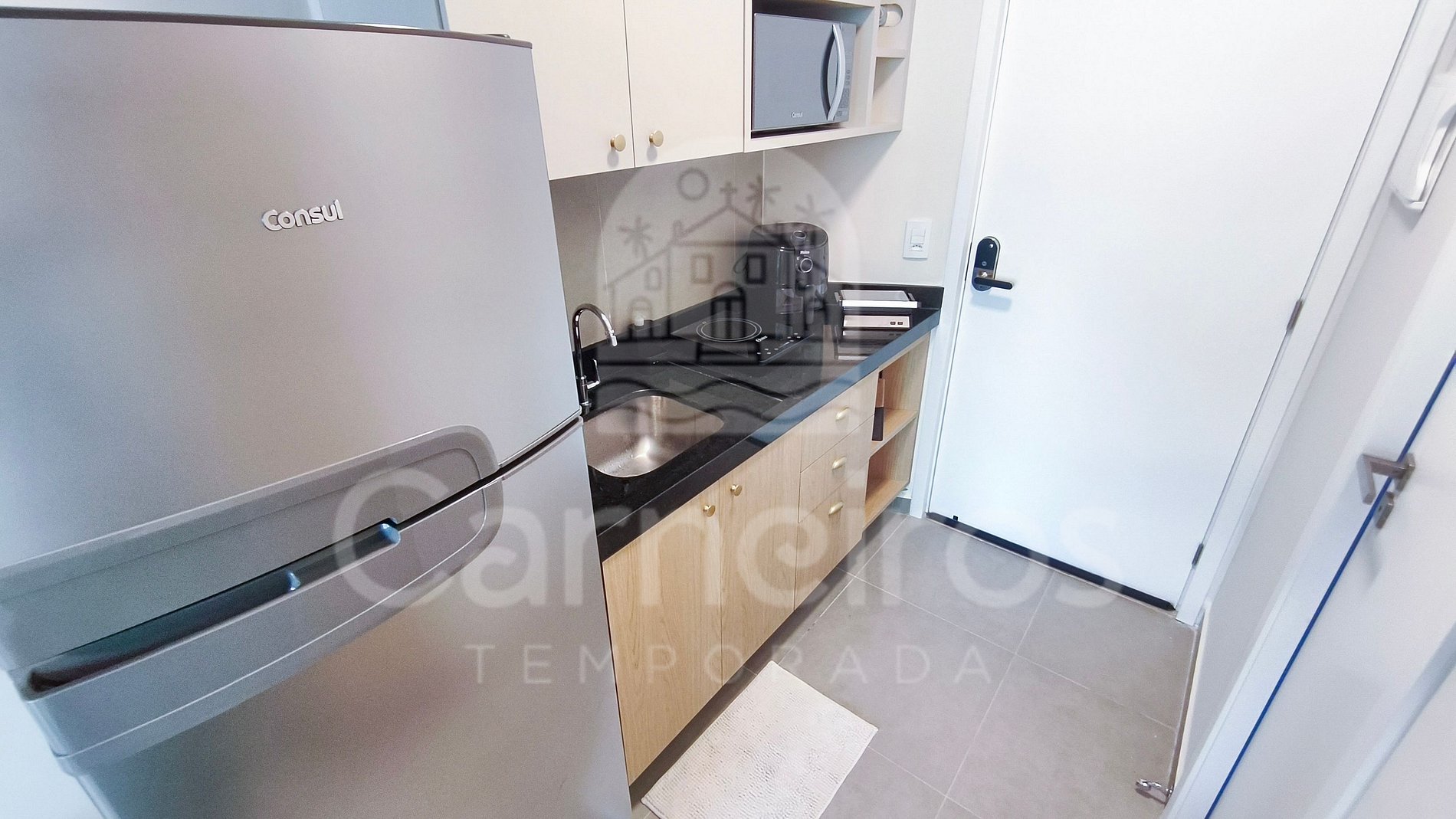 O ambiente integrado possui decoração aconchegante. O studio possui varanda, quarto, cozinha e banheiro. A cozinha é completa com geladeira, fogão, airfryer, sanduicheira, cafeteira elétrica, liquidificador, entre outros utensílios. O studio possui TV, ar condicionado e um banheiro completo. Há também varanda de frente para piscina e mesa para 4 lugares.