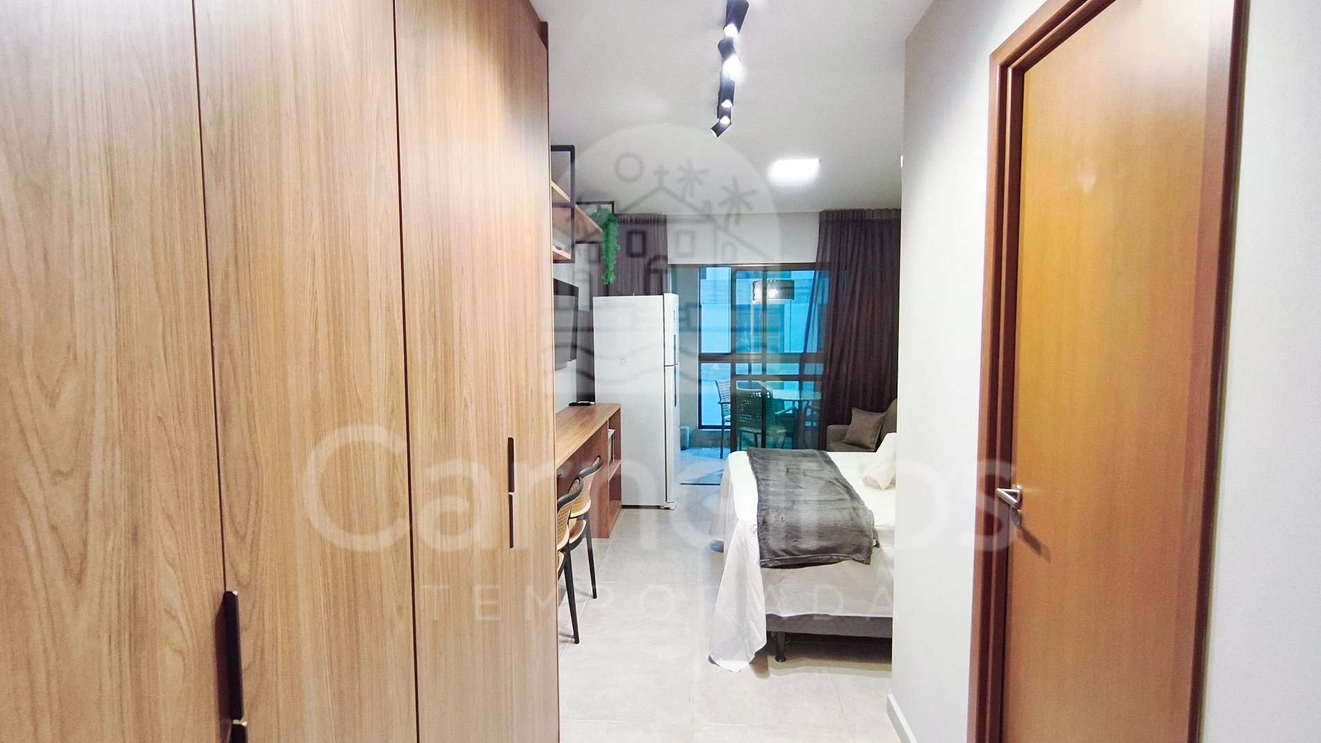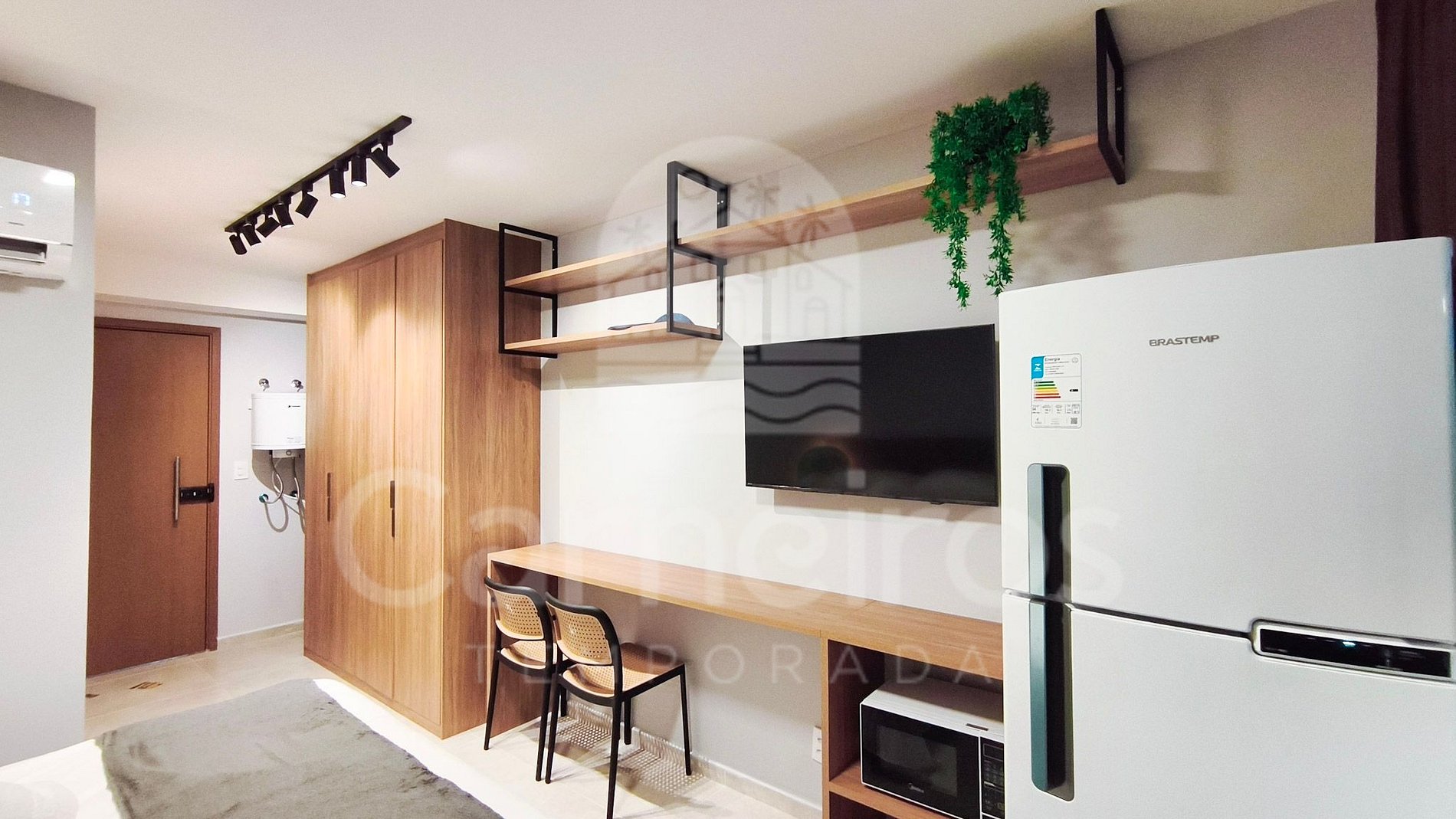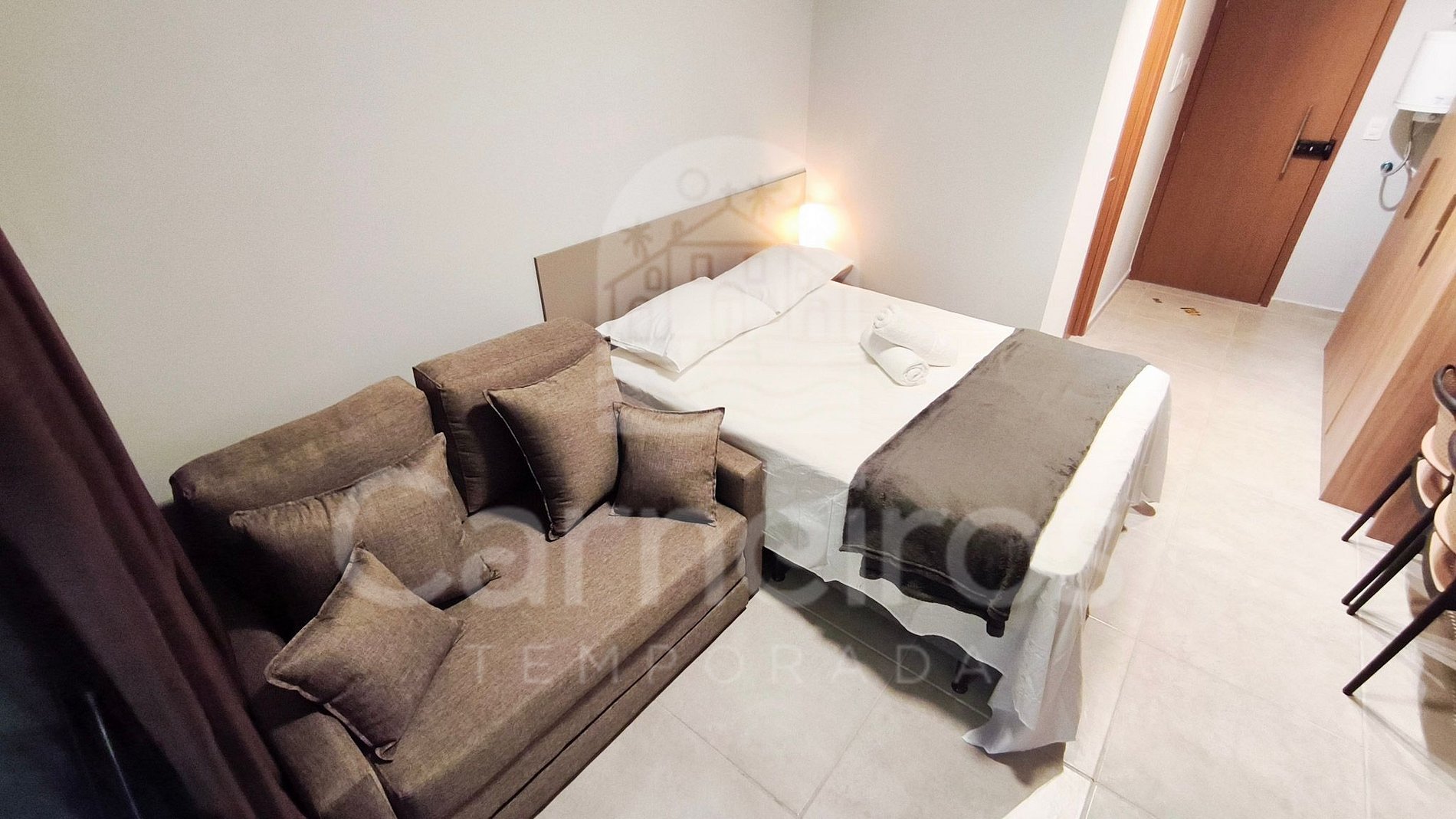 O studio é composto por: 1 cama de casal, 1 sofá-cama casal, armário, TV e ar-condicionado, oferecendo praticidade e conforto em um ambiente funcional e bem planejado.