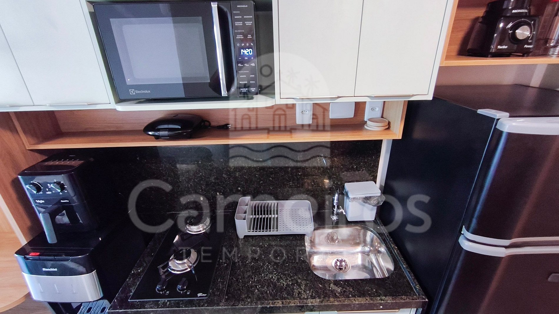 O ambiente integrado apresenta uma decoração aconchegante e moderna, proporcionando conforto e praticidade. A cozinha é totalmente equipada, com geladeira, cooktop de duas bocas, micro-ondas, airfryer, sanduicheira, liquidificador e diversos utensílios para o preparo de refeições.