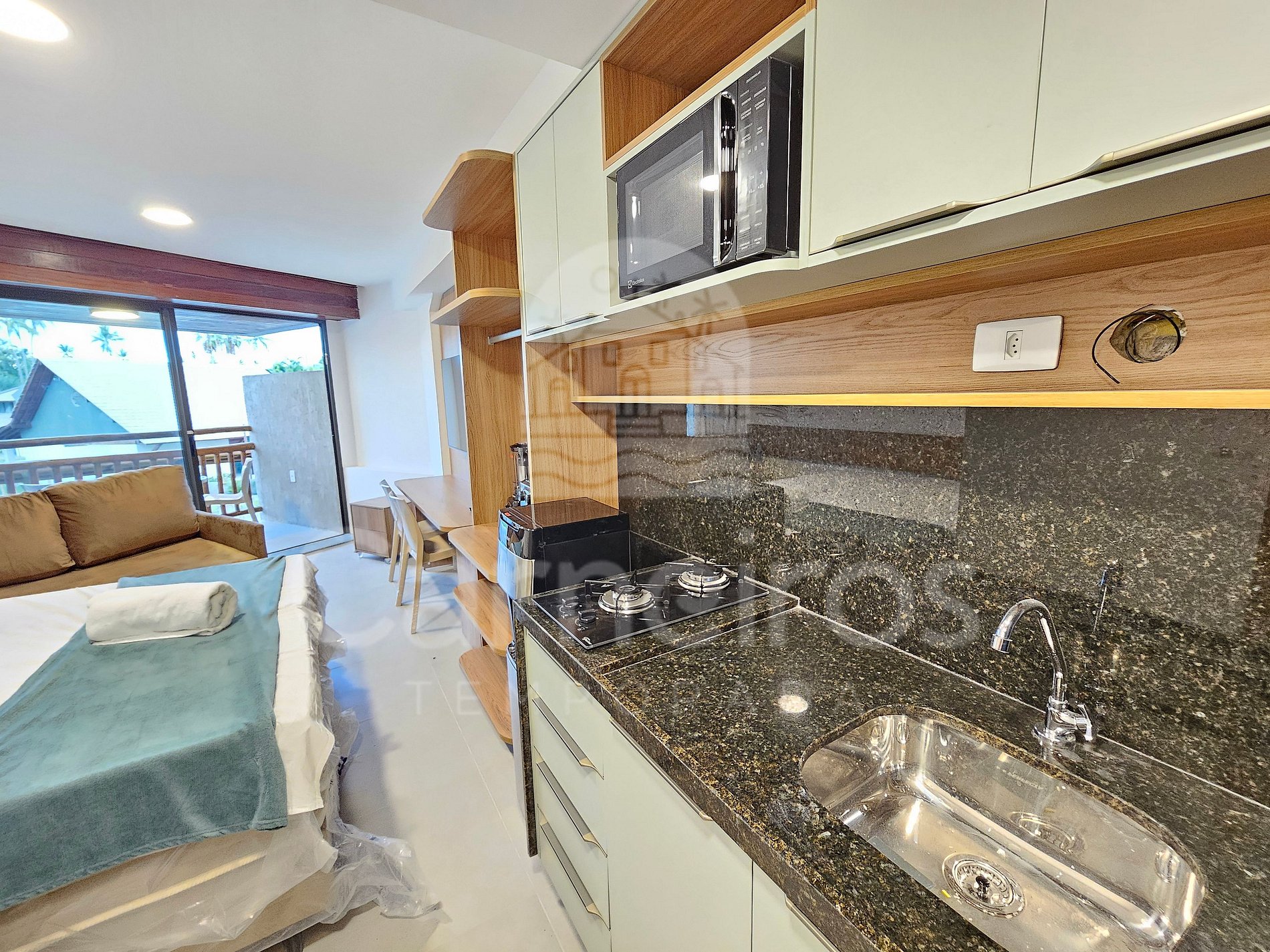 O ambiente integrado possui decoração aconchegante e moderna. A cozinha é completa com geladeira, fogão cooktop duas bocas, micro-ondas, airfryer, sanduicheira, cafeteira, liquidificador, cooler para praia e piscina, entre outros utensílios. O studio possui TV, ar-condicionado, bancada com cadeiras, armários e um banheiro completo.