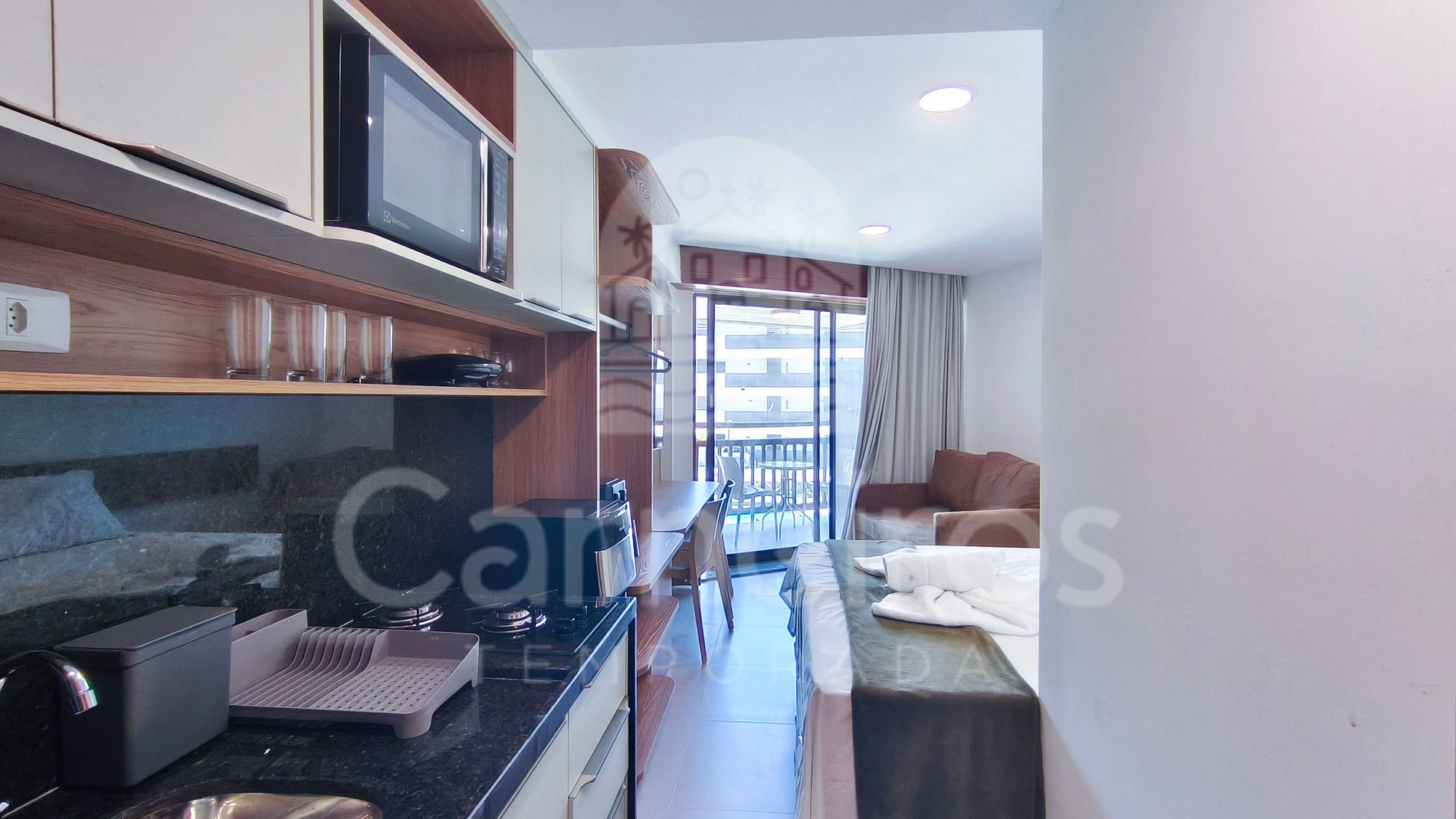 O ambiente integrado apresenta uma decoração aconchegante e moderna, proporcionando conforto e praticidade. A cozinha é totalmente equipada, com geladeira, cooktop de duas bocas, micro-ondas, airfryer, sanduicheira, liquidificador e diversos utensílios para o preparo de refeições.