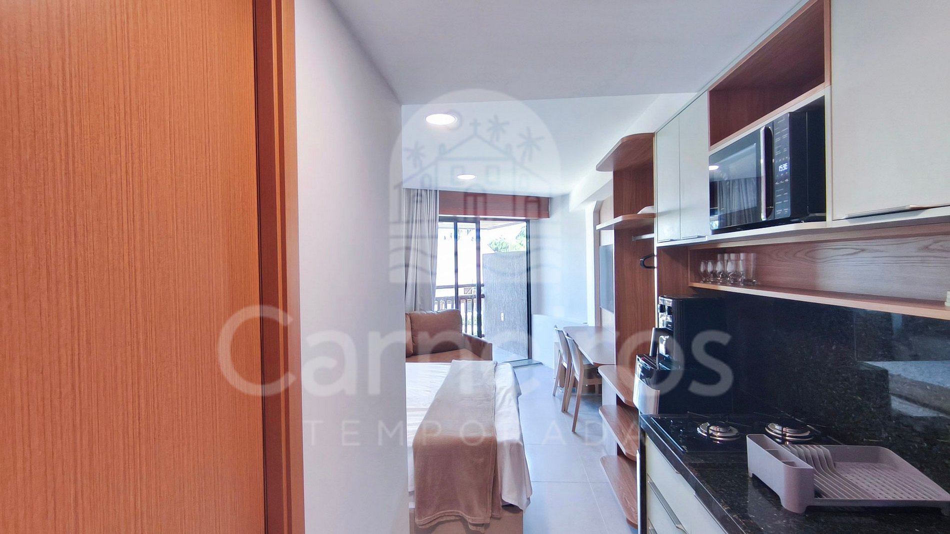O ambiente integrado apresenta uma decoração aconchegante e moderna, proporcionando conforto e praticidade. A cozinha é totalmente equipada, com geladeira, cooktop de duas bocas, micro-ondas, airfryer, sanduicheira, liquidificador e diversos utensílios para o preparo de refeições.