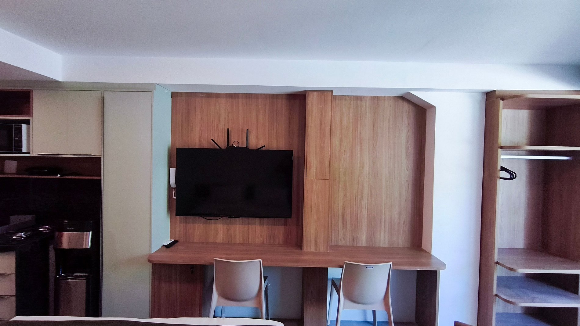 Acomoda até 4 pessoas. Ambiente climatizado com TV, bancada com cadeiras e armários planejados. Configuração de camas: 02 camas de solteiro (que podem ser unidas para formar 01 cama de casal) e 01 sofá-cama de casal.