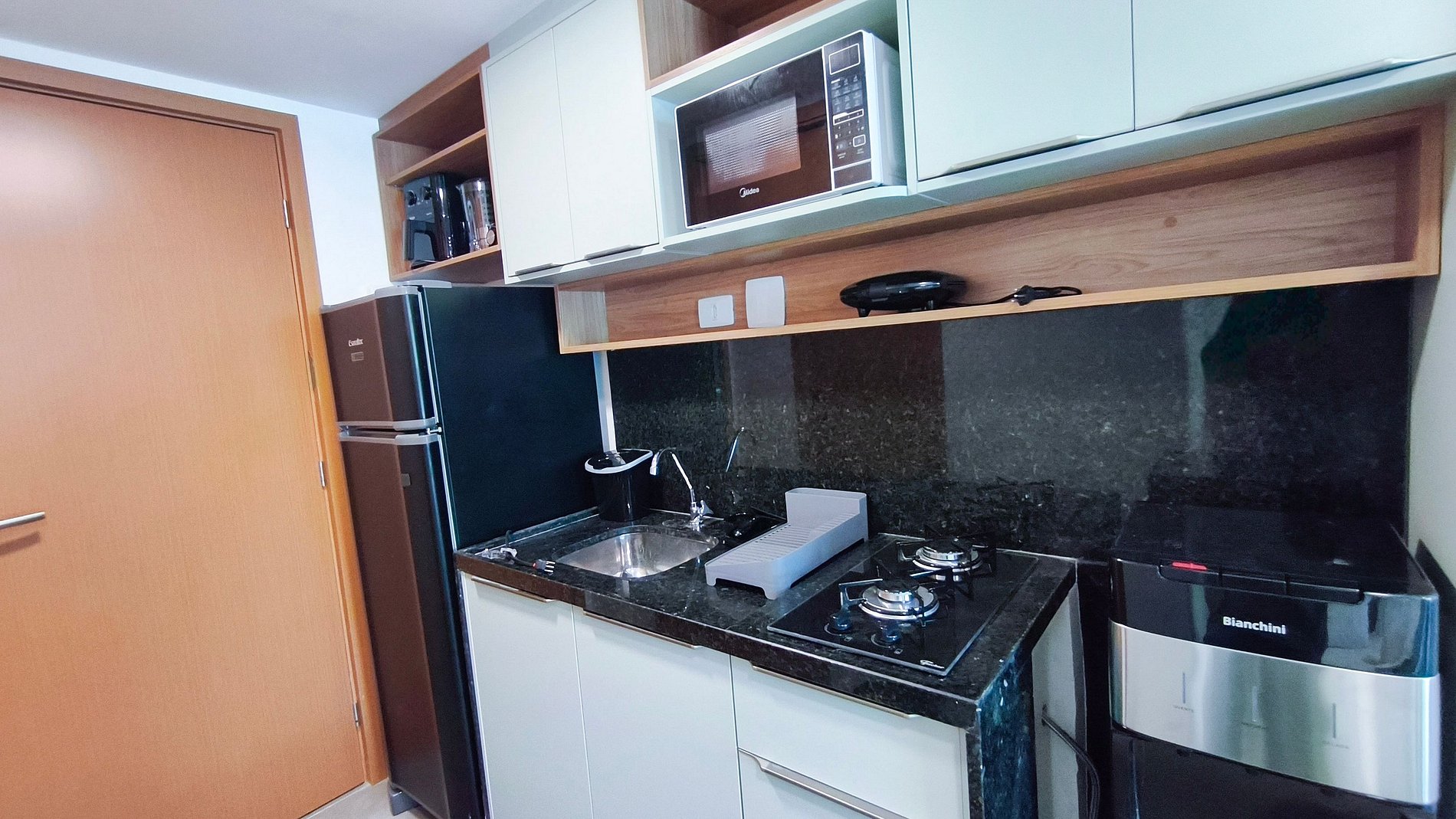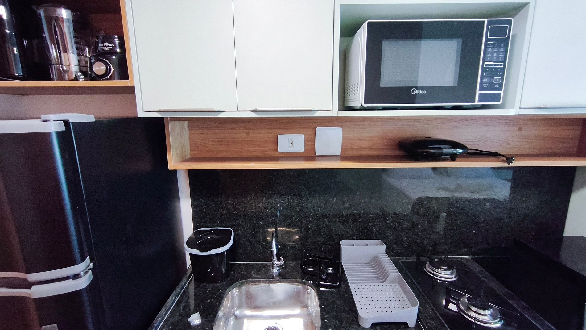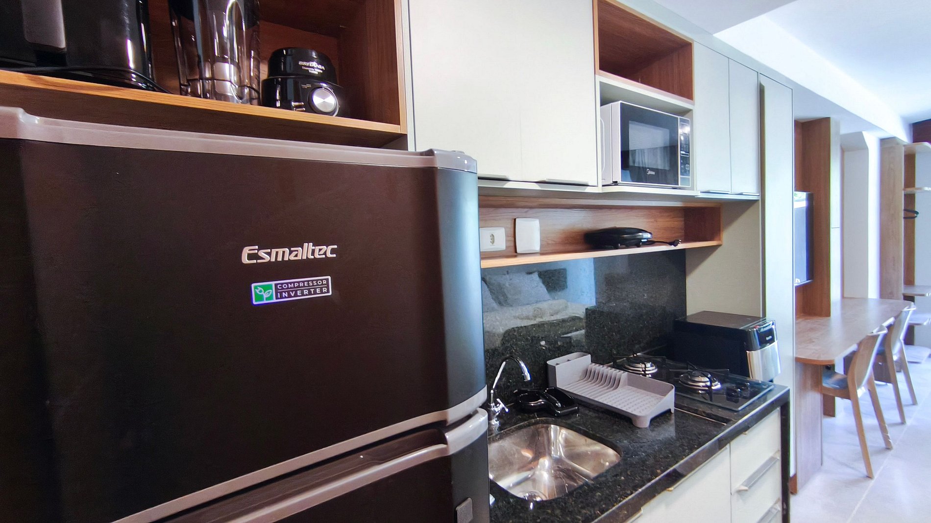 Cozinha - Equipada com geladeira, cooktop de duas bocas, micro-ondas, airfryer, sanduicheira, liquidificador e utensílios para refeições.