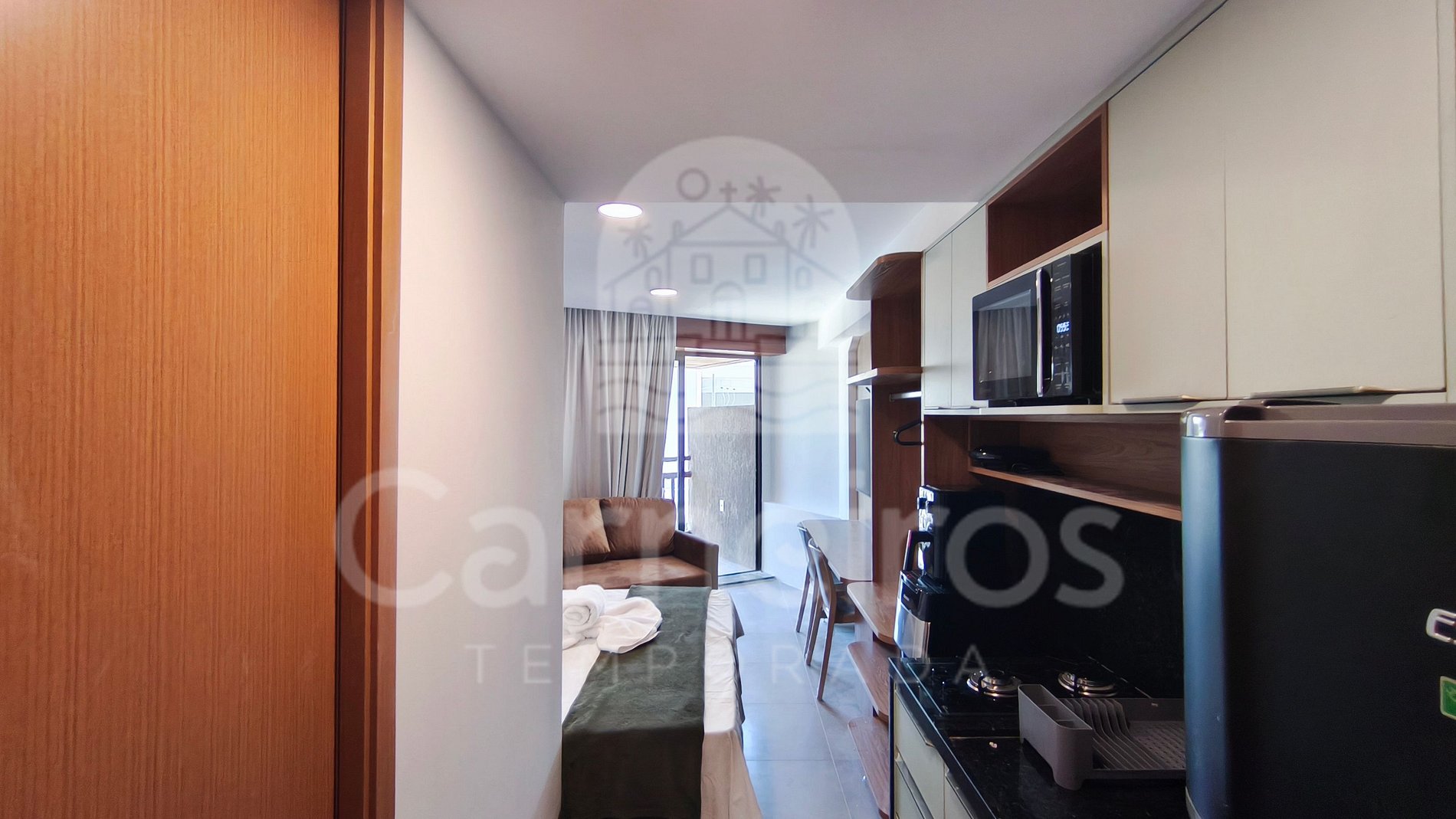 O studio dispõe de TV, ar-condicionado, bancada com cadeiras, armários planejados e banheiro completo.
