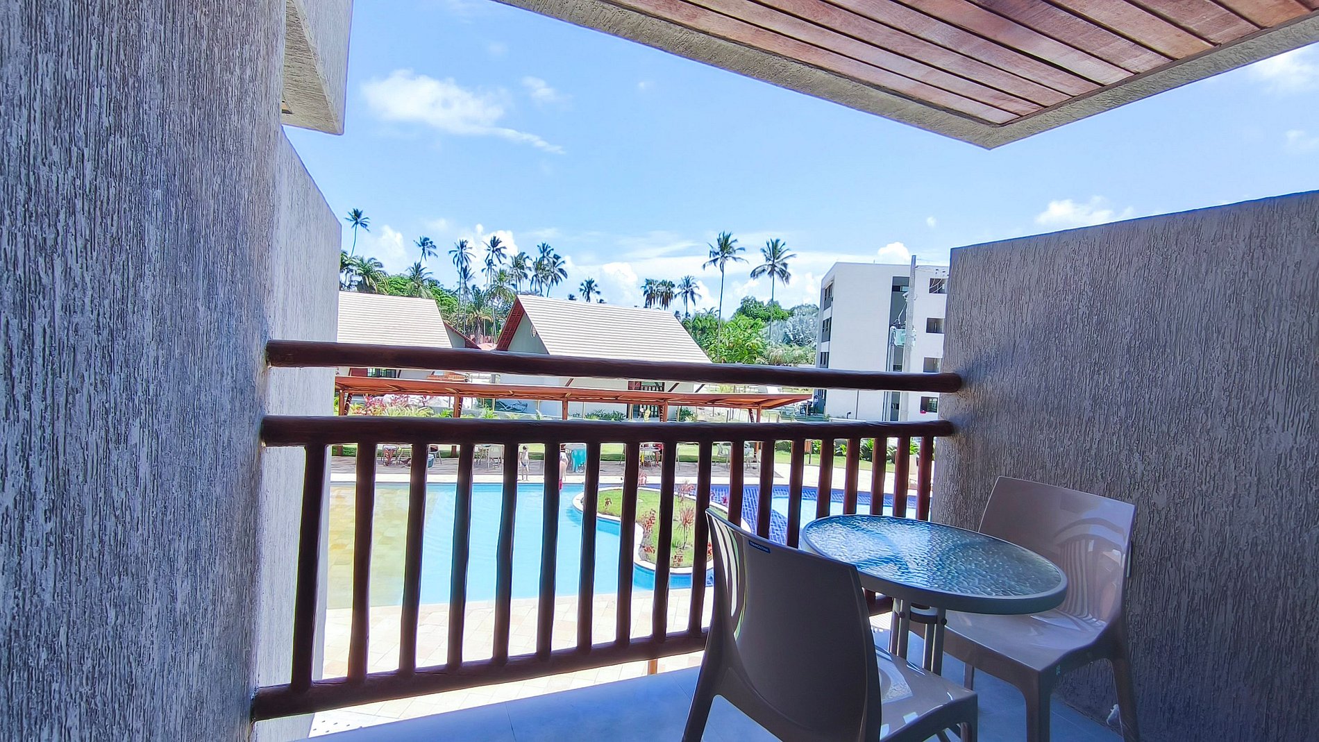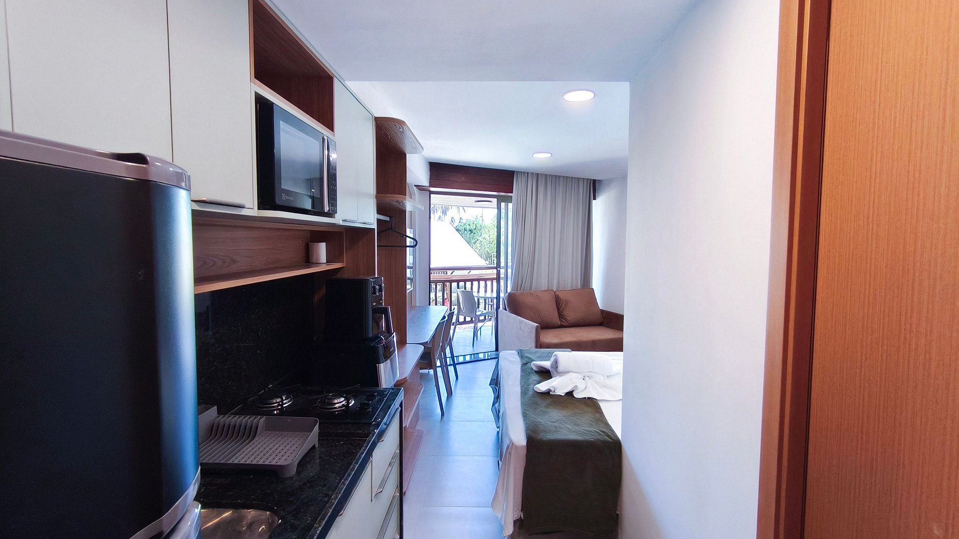 Studio em condomínio à beira-mar na Praia dos Carneiros, acomodando até 4 hóspedes. O espaço dispõe de 2 camas de solteiro (configuráveis como casal) e 1 sofá-cama de casal, além de cozinha completa e varanda mobiliada. A estrutura do condomínio oferece lazer completo com piscinas, academia, estacionamento, elevador, restaurante e conveniência.