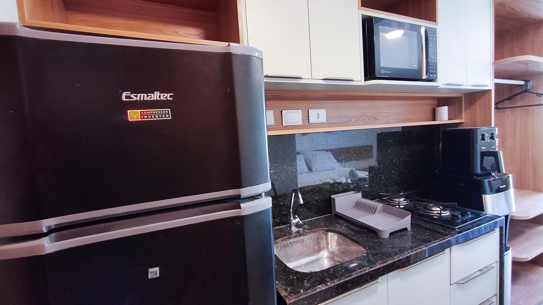 Cozinha - Espaço equipado com geladeira, cooktop de duas bocas, micro-ondas, airfryer, armários planejados e utensílios básicos para preparo de refeições.