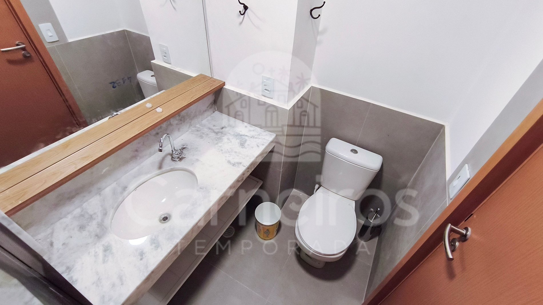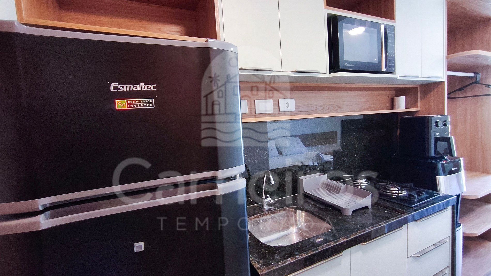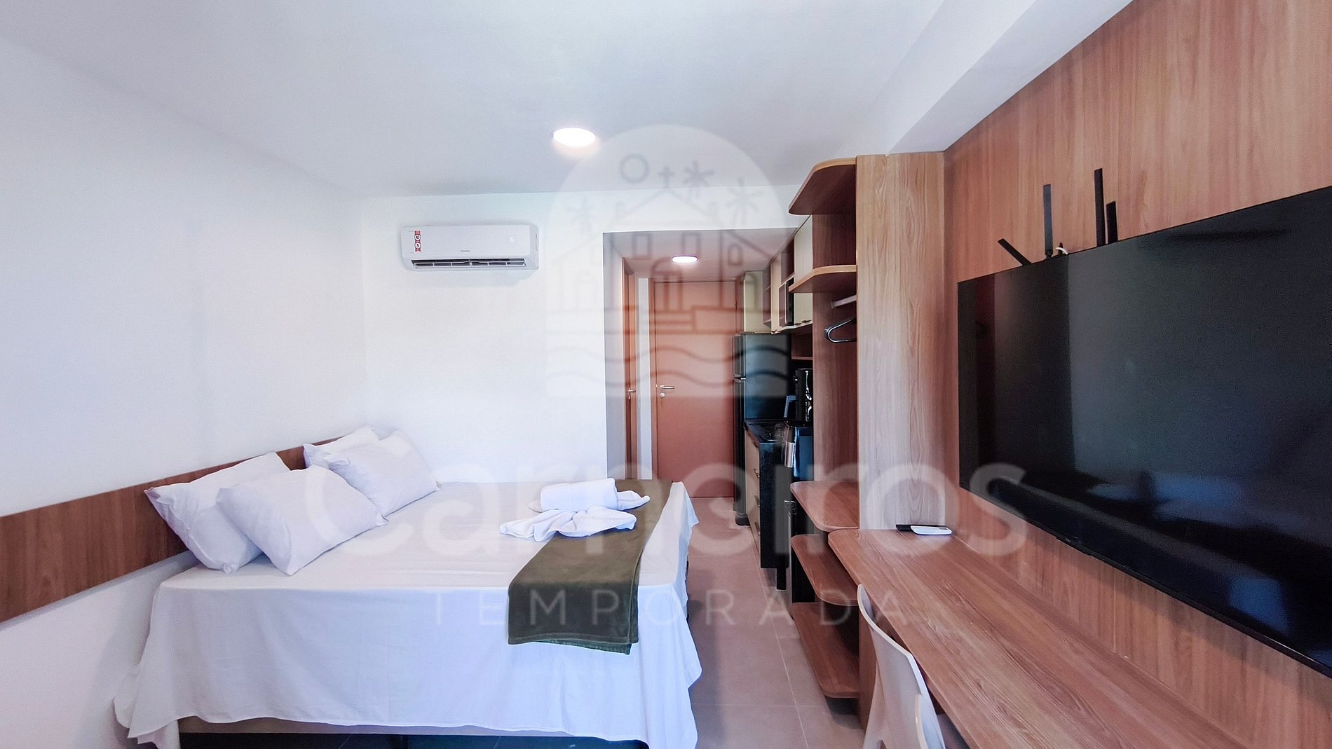 O studio dispõe de TV, ar-condicionado, bancada com cadeiras, armários planejados e banheiro completo.