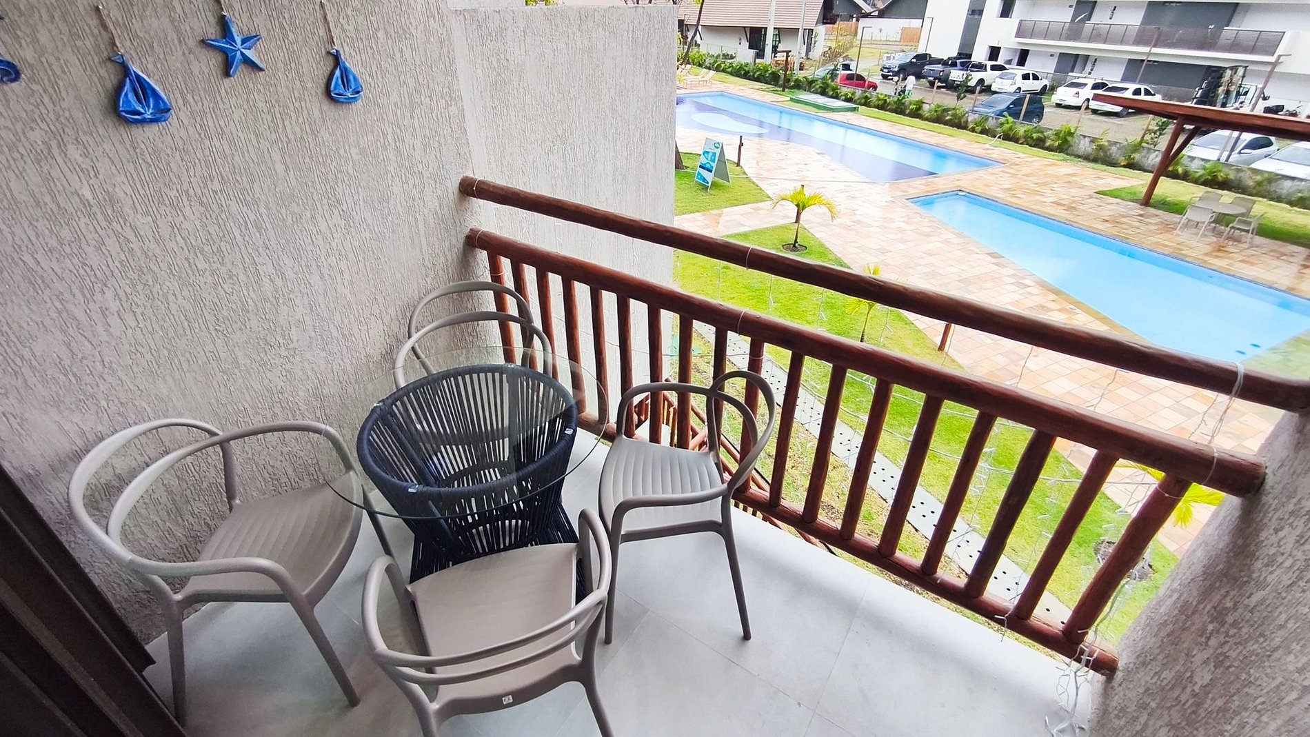 Varanda - Espaço privativo localizado no primeiro andar com vista para a piscina.