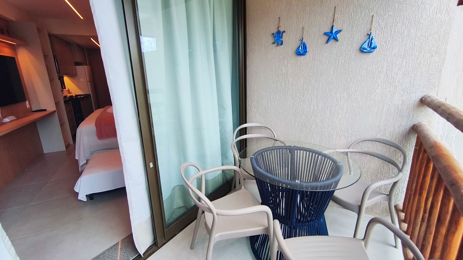 O Studio acomoda até quatro hóspedes em um ambiente integrado com varanda voltada para a piscina e climatização completa. O espaço apresenta cozinha equipada para total praticidade durante a estadia. O condomínio Carneiros Atlântico oferece estrutura à Beira-Mar com piscinas, prainha, academia e salão de jogos. A comodidade é garantida pelo restaurante local, minimercado 24h, estacionamento e espaço kids.