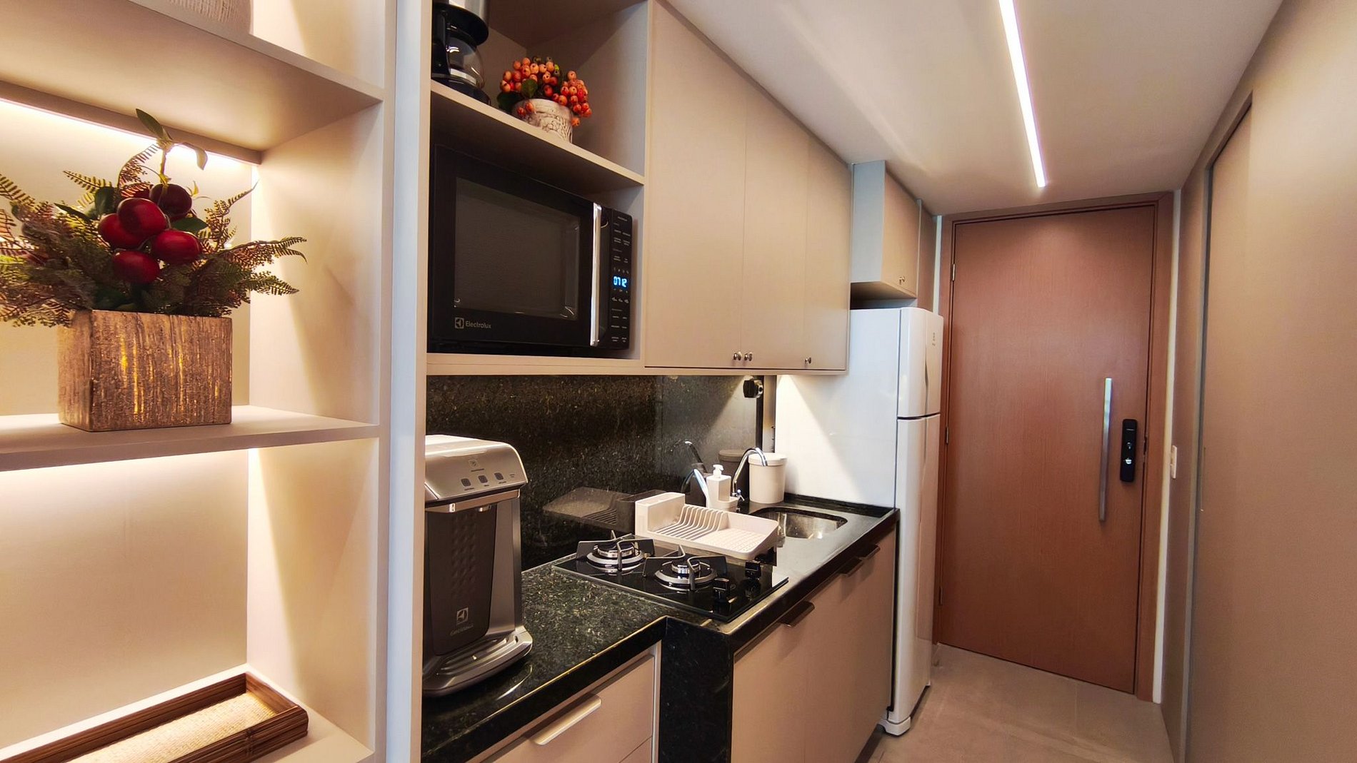 Cozinha - Equipada com geladeira, fogão cooktop de duas bocas, micro-ondas, airfryer, sanduicheira, cafeteira, liquidificador e purificador de água.
