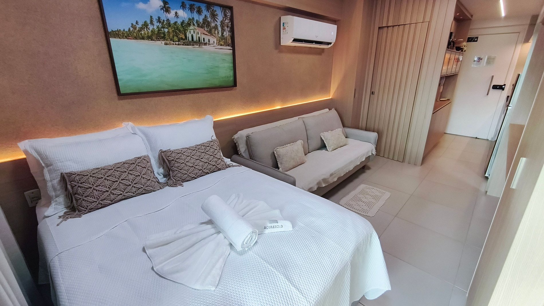 - Estúdio: 1 cama casal + 1 Sofá-cama casal, TV, ar-condicionado e armário.