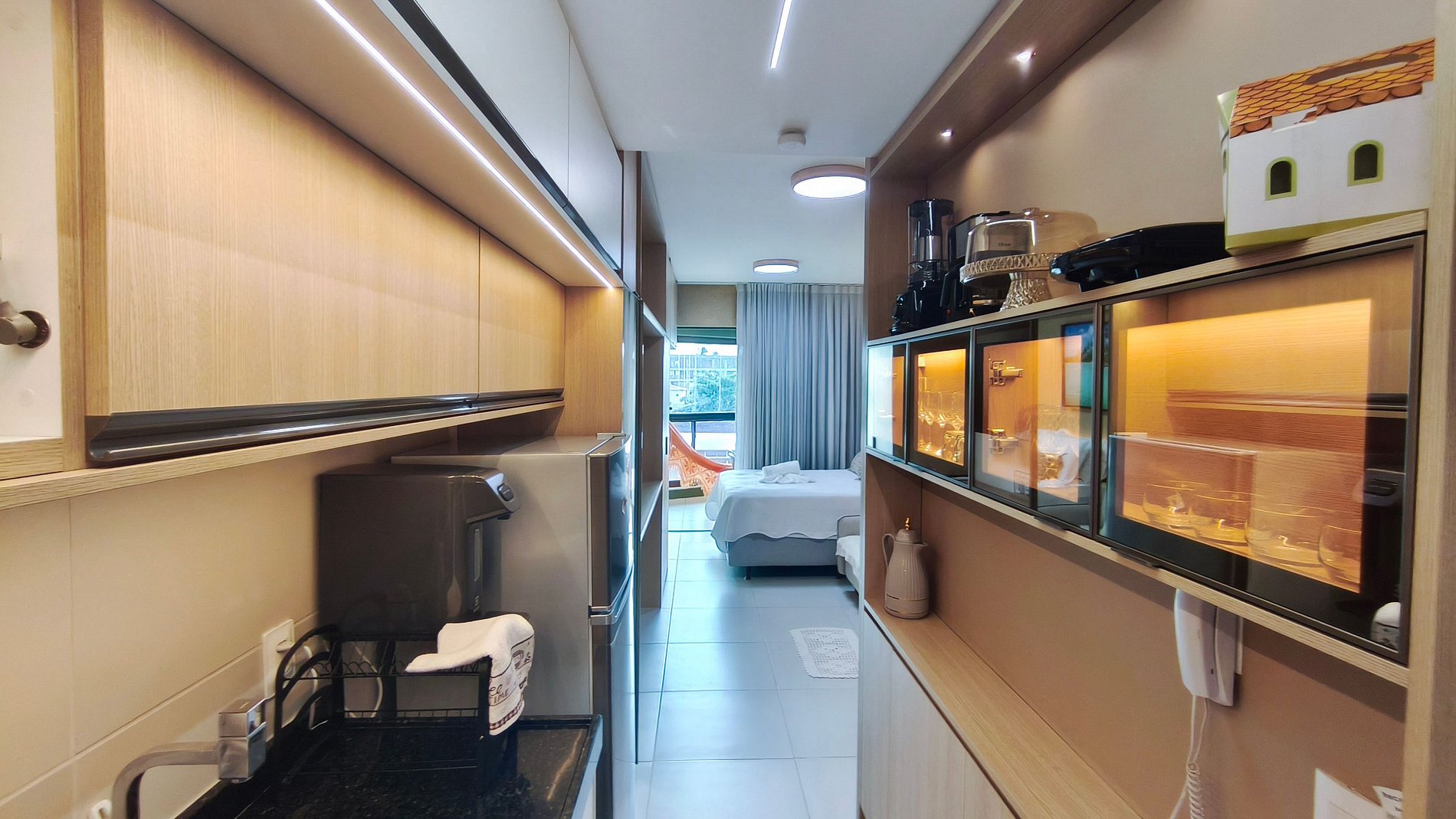 No imóvel você encontrará uma decoração agradável e moderna com TV, cama e sofá-cama. A cozinha é completa e possui diversas comodidades como louça, copos, panelas, talheres, sanduicheira, cafeteira, fogão cooktop 2 bocas, geladeira, liquidificador e diversos utensílios. Possui também 01 banheiro completo.