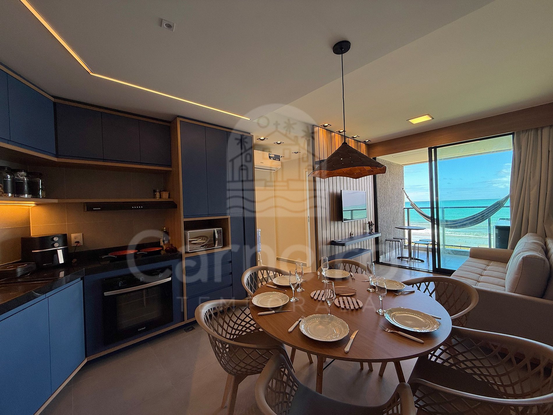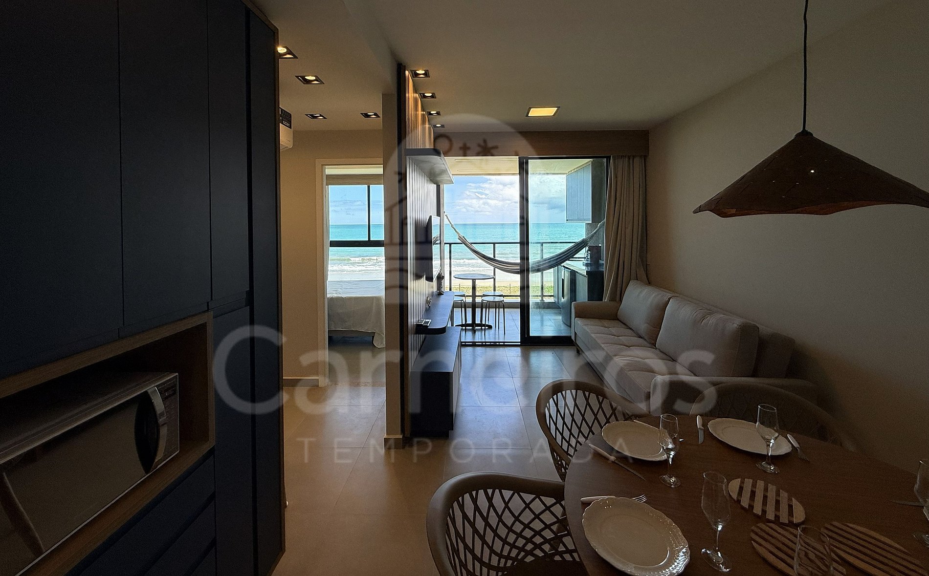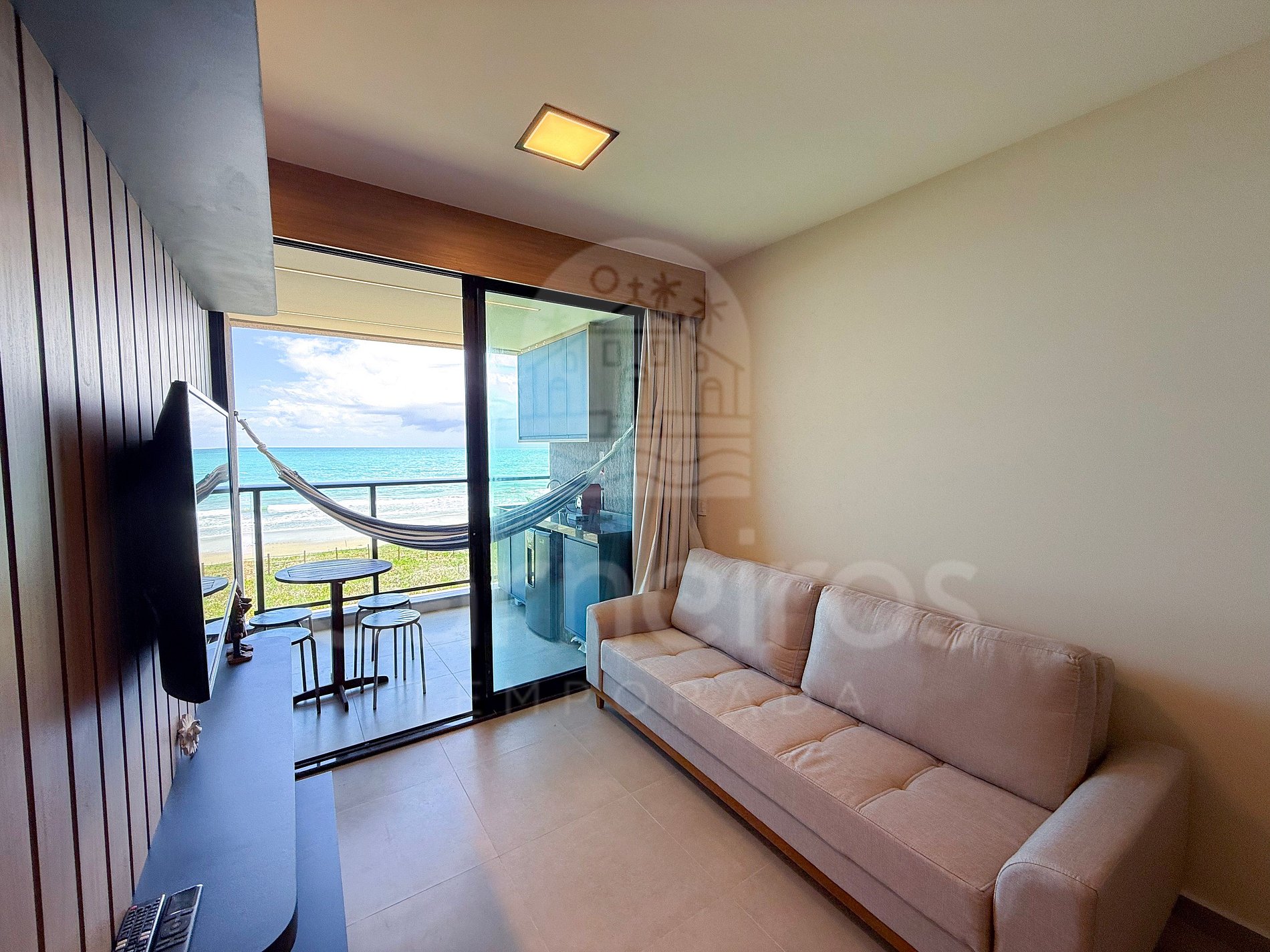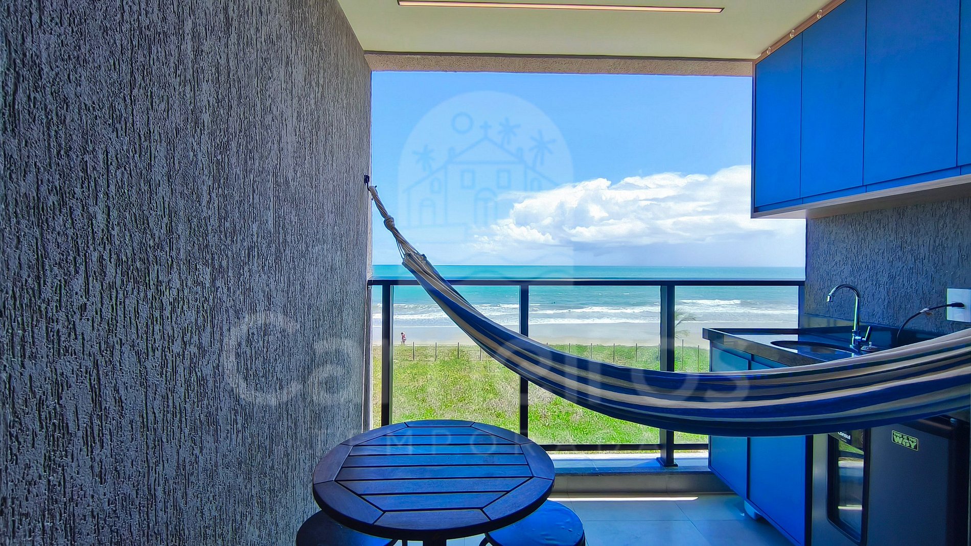 O imóvel possui ambientes modernos com vistas deslumbrantes do mar. Dispõe de varanda gourmet com armador de rede, cervejeira, pia, mesa e cadeiras. A cozinha é completa e integrada, equipada com geladeira, fogão, airfryer, sanduicheira, cafeteira elétrica, liquidificador, botijão de água, mesa de jantar e diversos utensílios. O flat conta com 2 banheiros completos, sendo 1 suíte.