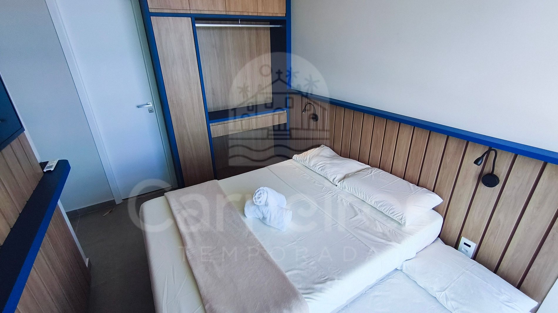Quarto: 01 cama de casal + 01 bicama, armário e ar-condicionado;