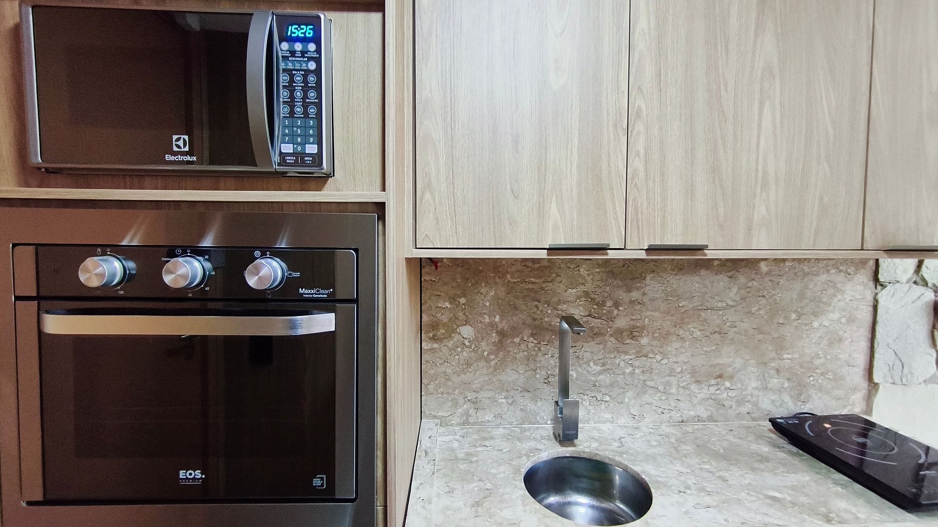 Cozinha - Pia, armários, geladeira compacta, fogão cooktop 1 boca, microondas e airfryer.