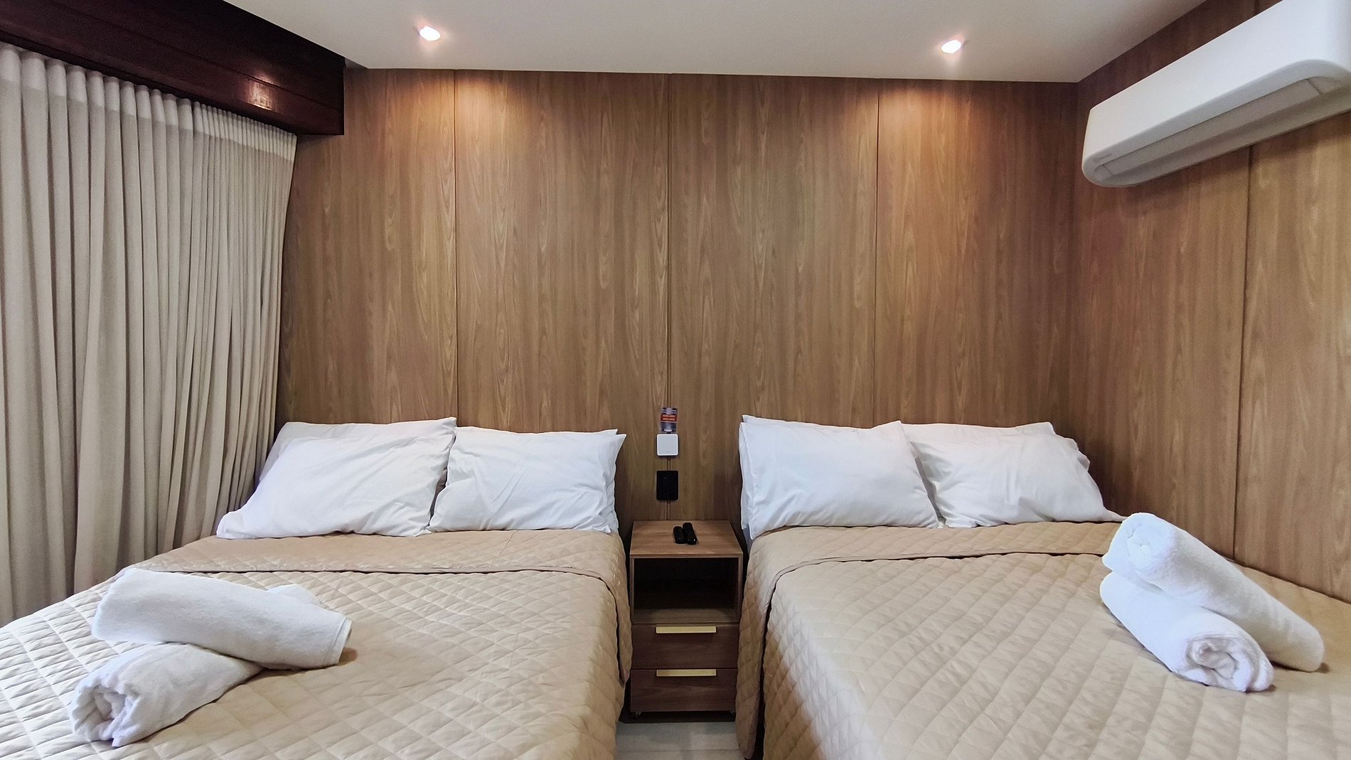 Acomoda até 04 hóspedes em duas camas de casal queen. O ambiente é climatizado com ar-condicionado, possui TV e decoração moderna.