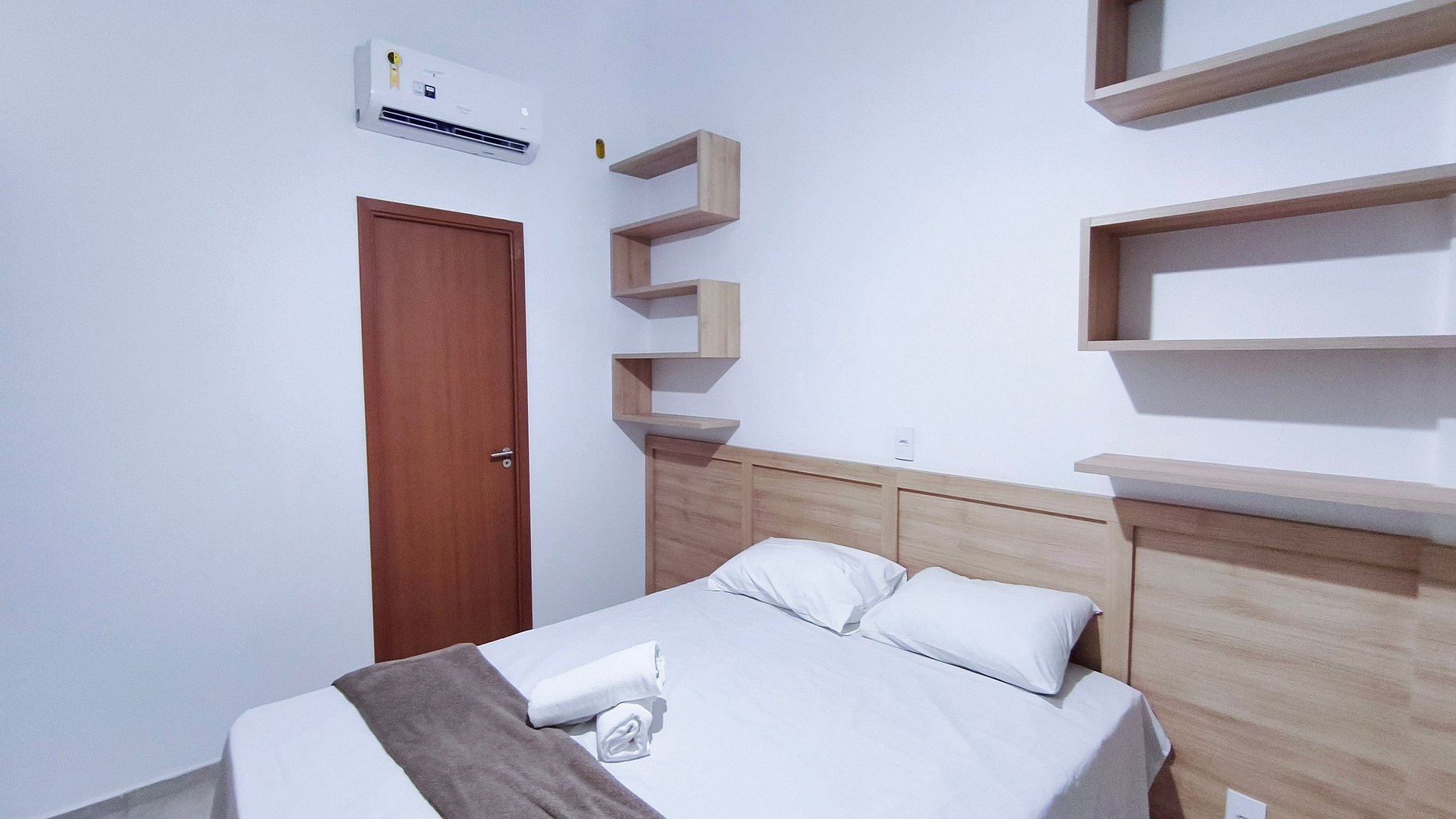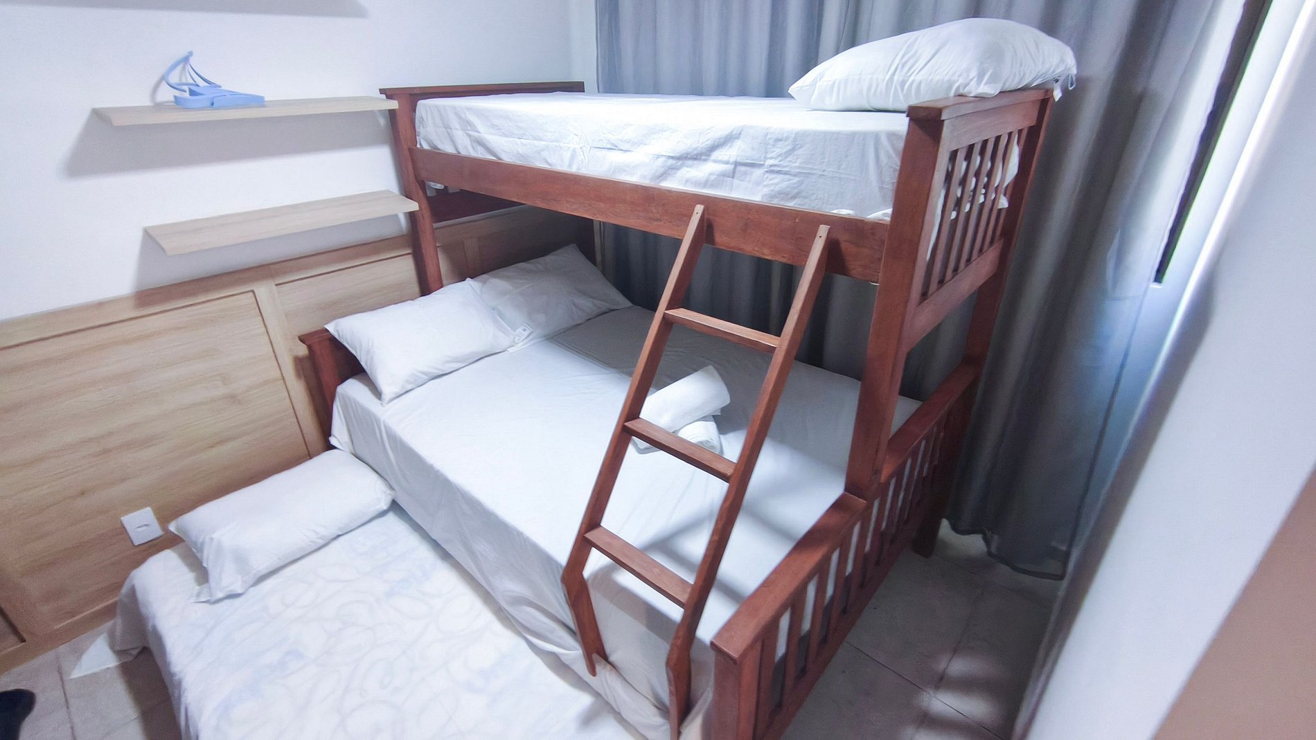 Quarto 1: 01 cama Queen + 01 colchão solteiro, armário e ar-condicionado.