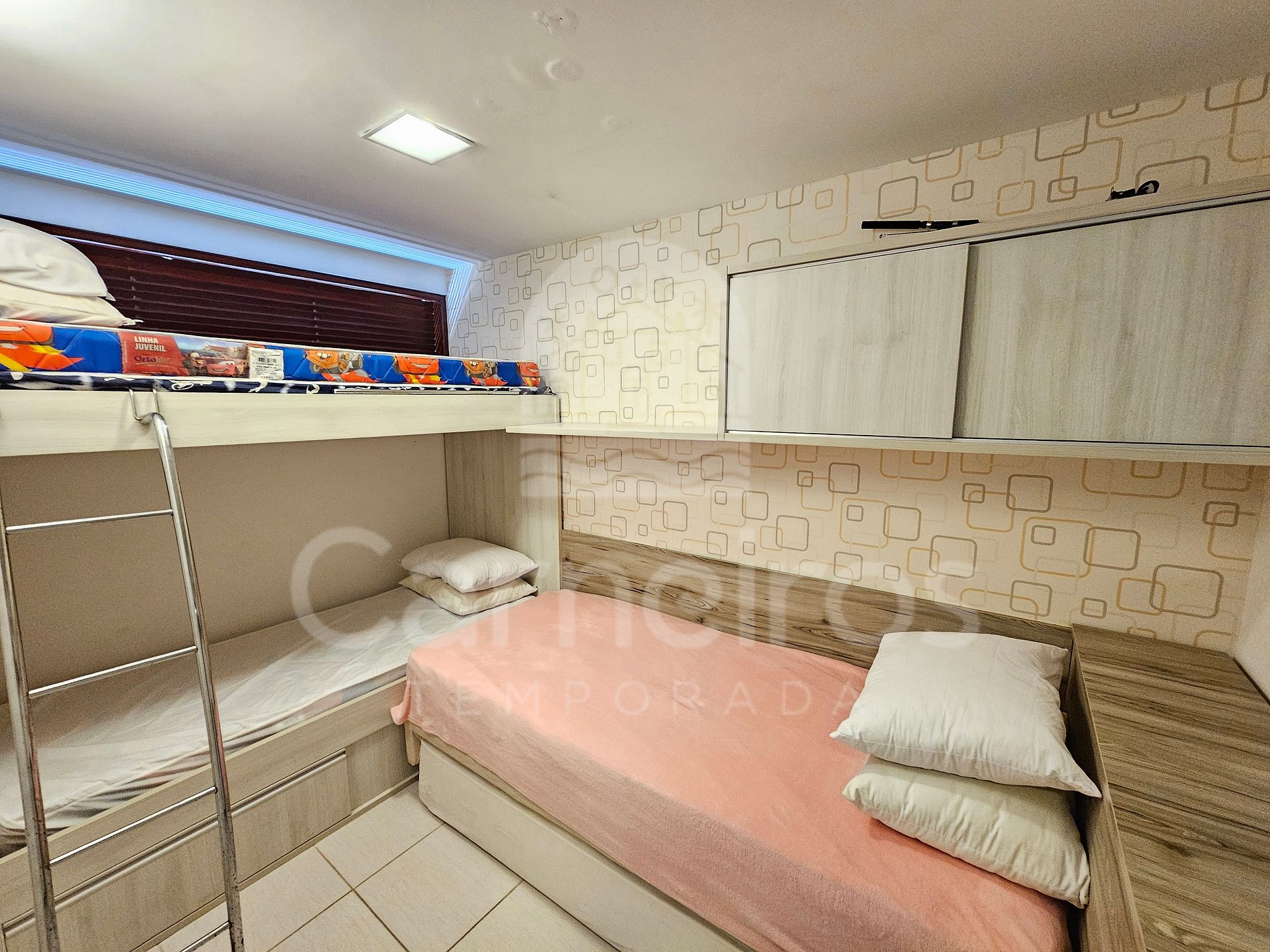 - Quarto 01: 01 beliche, 01 cama de solteiro e 01 bicama e ar-condicionado; e