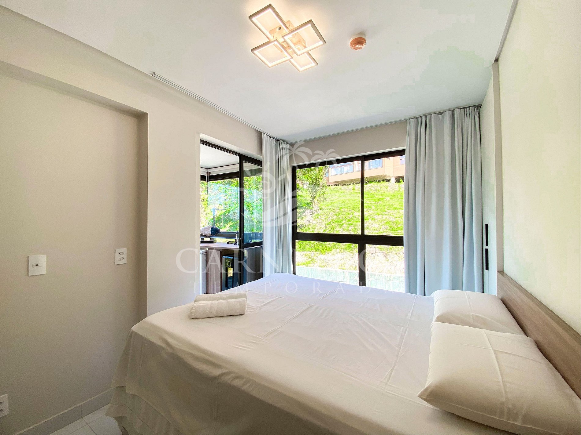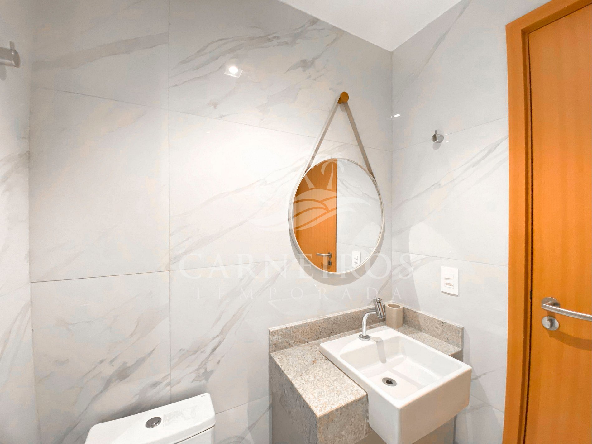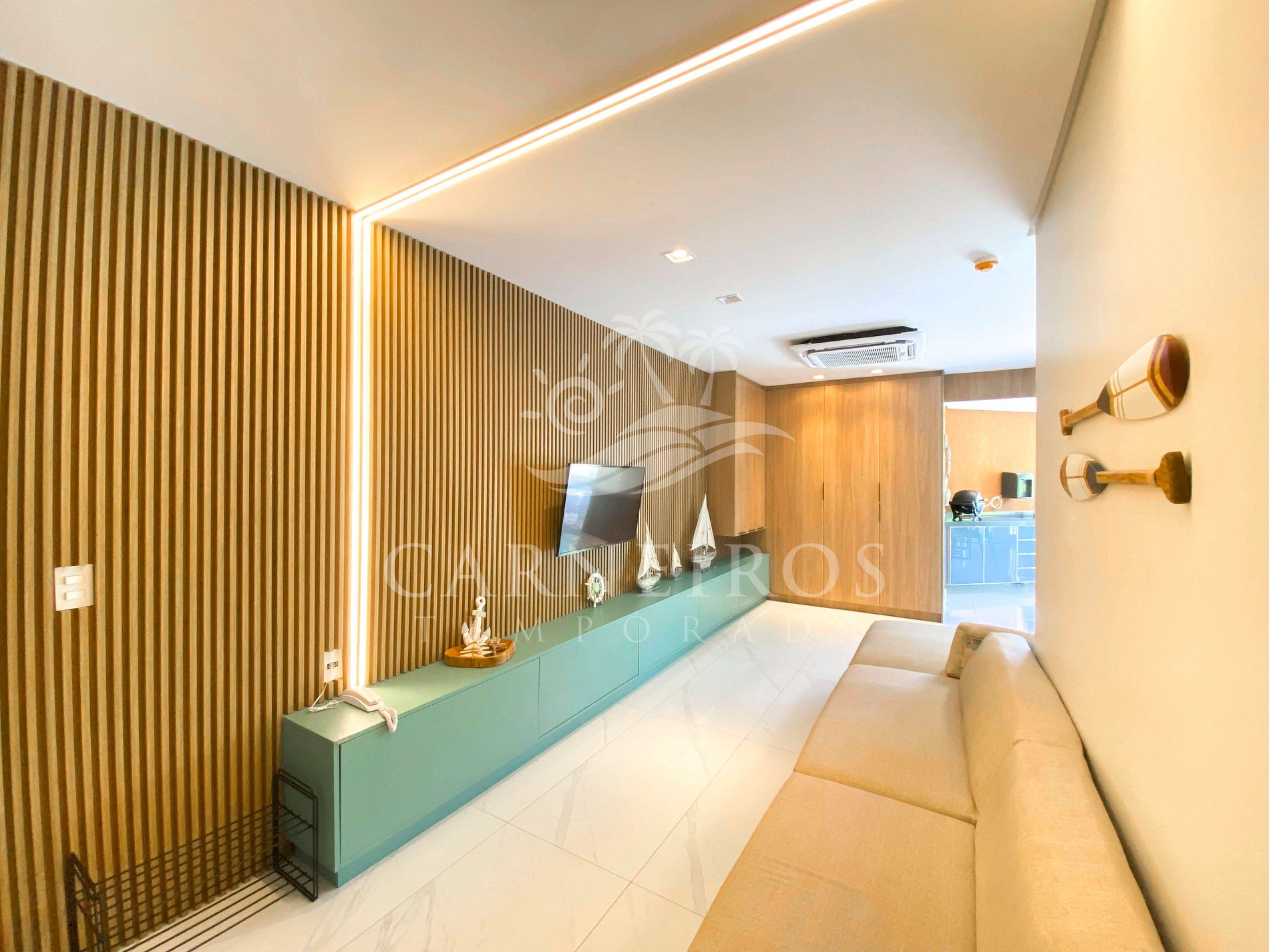 A sala de estar com uma decoração minimalista e aconchegante conta com um sofá, TV e ar-condicionado. A cozinha é completa e possui diversos itens como fogão cooktop com 04 bocas e forno, geladeira, micro-ondas, cafeteira e diversos utensílios, além de um balcão e 4 cadeiras. O flat possui 3 banheiros completos, sendo um WC social.
