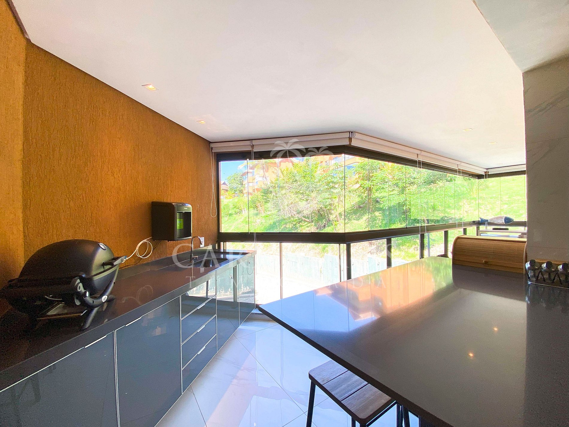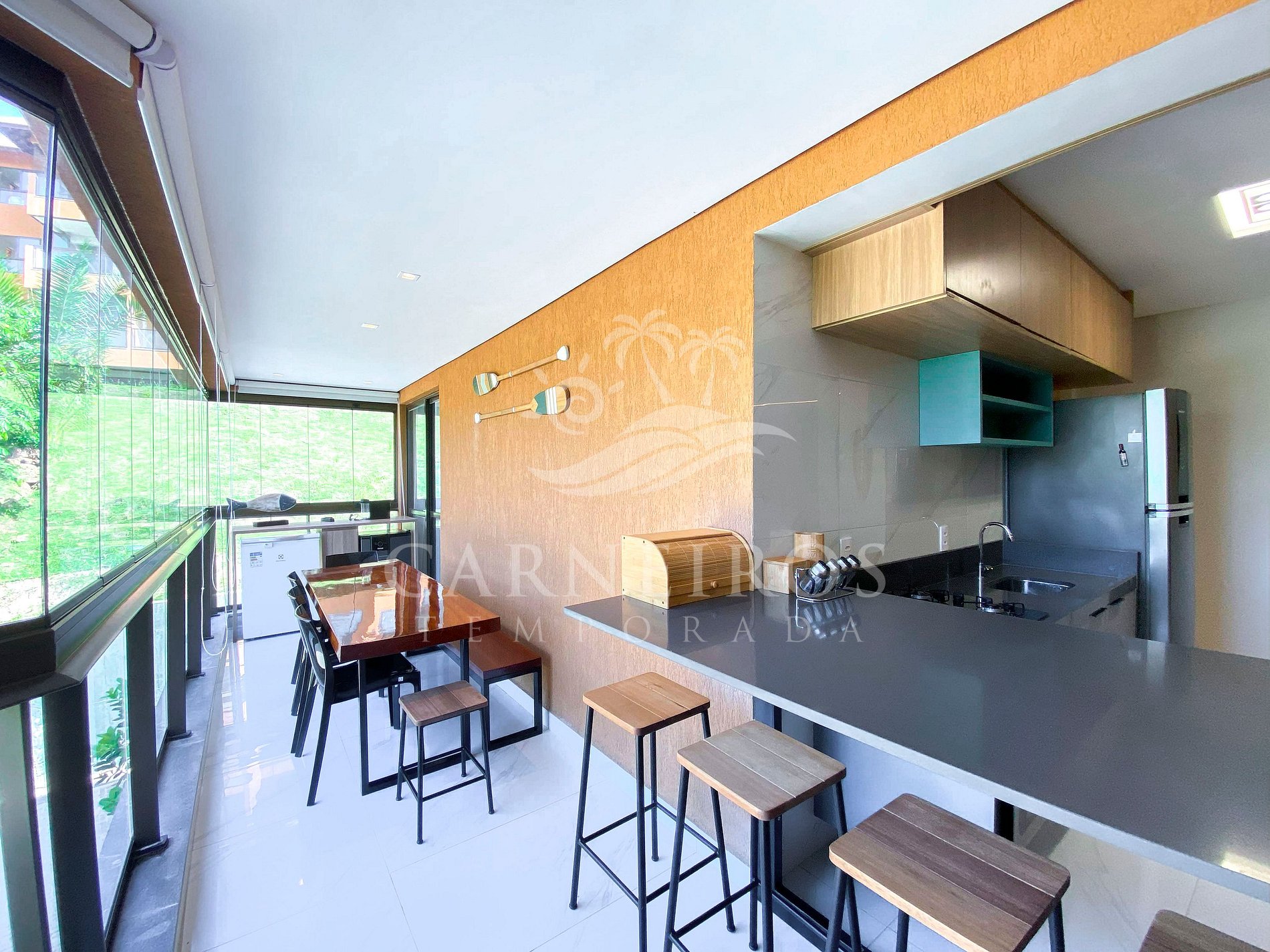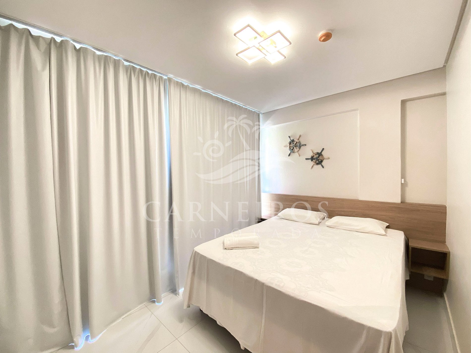 A sala de estar com uma decoração minimalista e aconchegante conta com um sofá, TV e ar-condicionado. A cozinha é completa e possui diversos itens como fogão cooktop com 04 bocas e forno, geladeira, micro-ondas, cafeteira e diversos utensílios, além de um balcão e 4 cadeiras. O flat possui 3 banheiros completos, sendo um WC social.