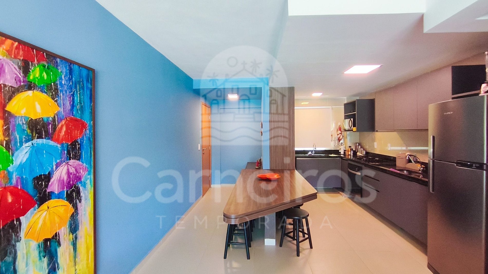 A sala de estar apresenta uma decoração moderna, com sofá, TV e ar-condicionado. A cozinha é totalmente equipada com os principais utensílios, panelas, fogão, forno, geladeira, liquidificador, micro-ondas, sanduicheira e outros. Possui 2 banheiros completos.