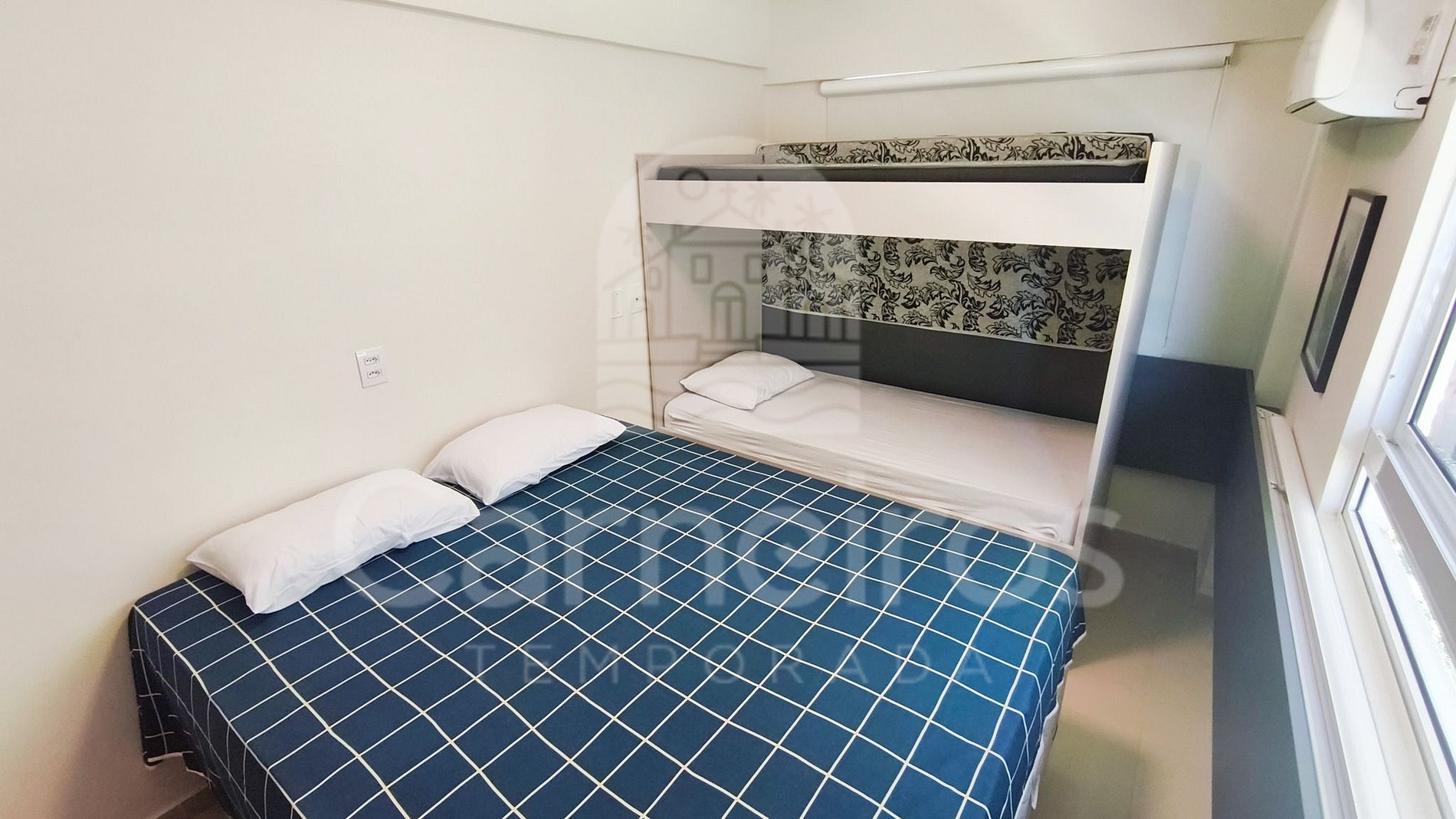 - Quarto 02: 1 cama de casal + 1 beliche, ar-condicionado e armário;