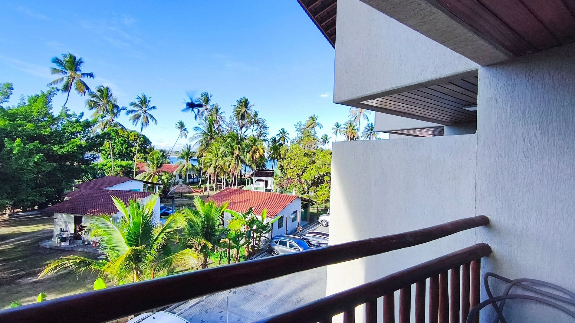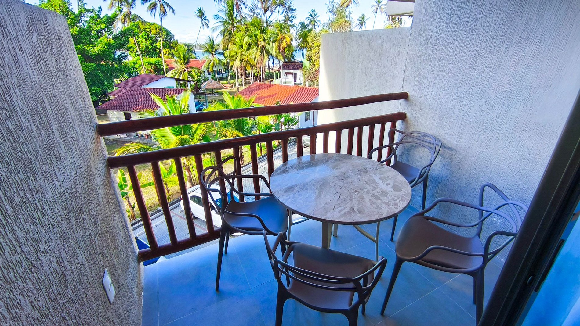Varanda - Espaço externo privativo no segundo andar com vista para o mar e coqueirais.