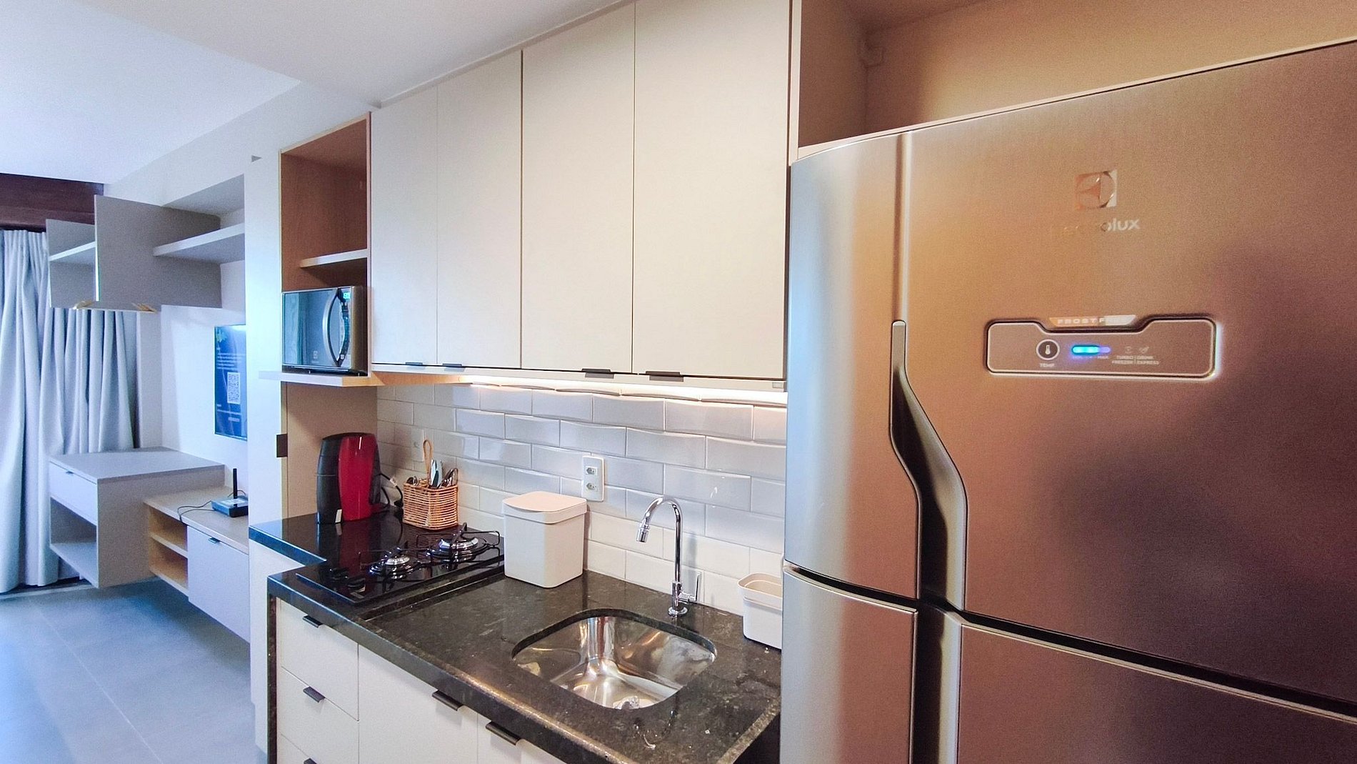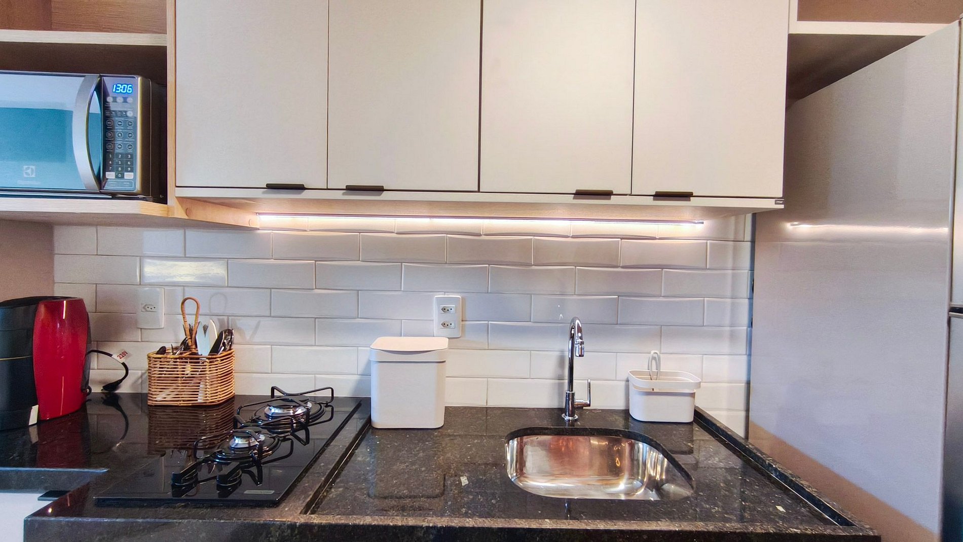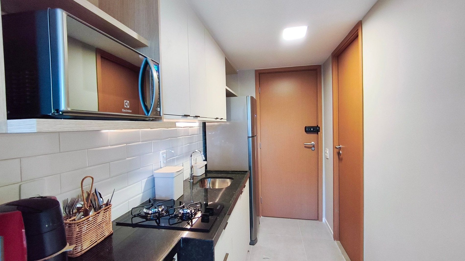 Cozinha - Equipada com geladeira, fogão de duas bocas, micro-ondas, armários e utensílios básicos.