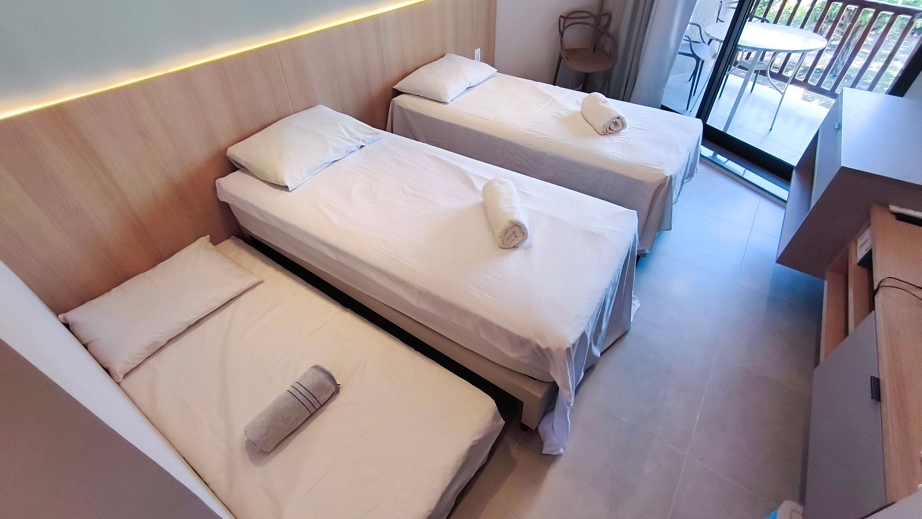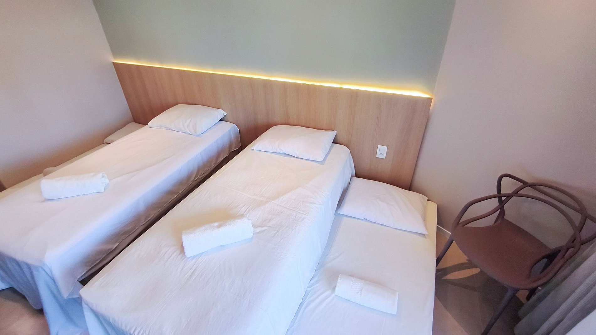 Ambiente climatizado com Wi-Fi e TV. Configuração de dormir flexível com 4 camas de solteiro que podem ser unidas para formar 2 camas de casal. Acomoda até 4 pessoas.