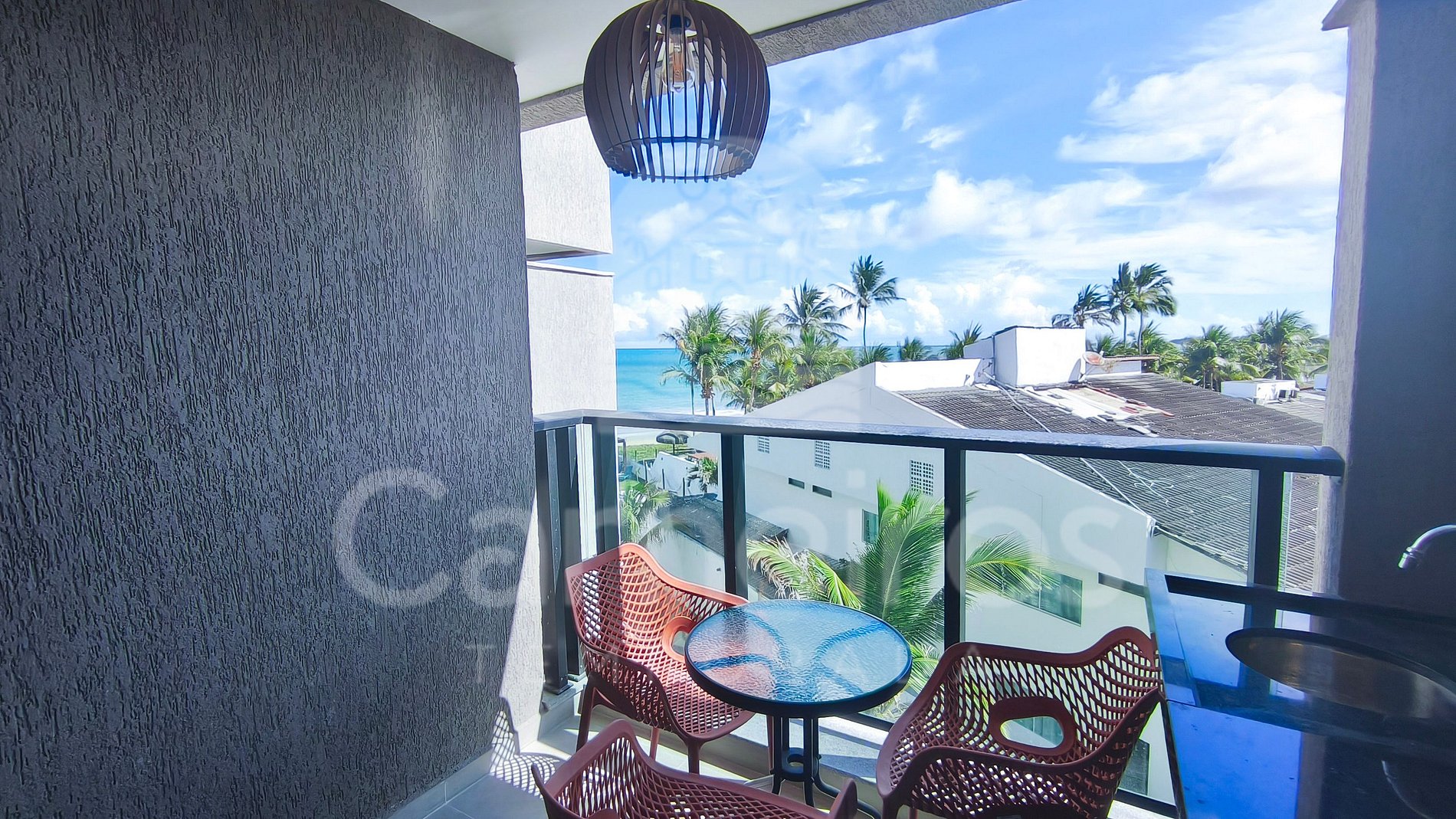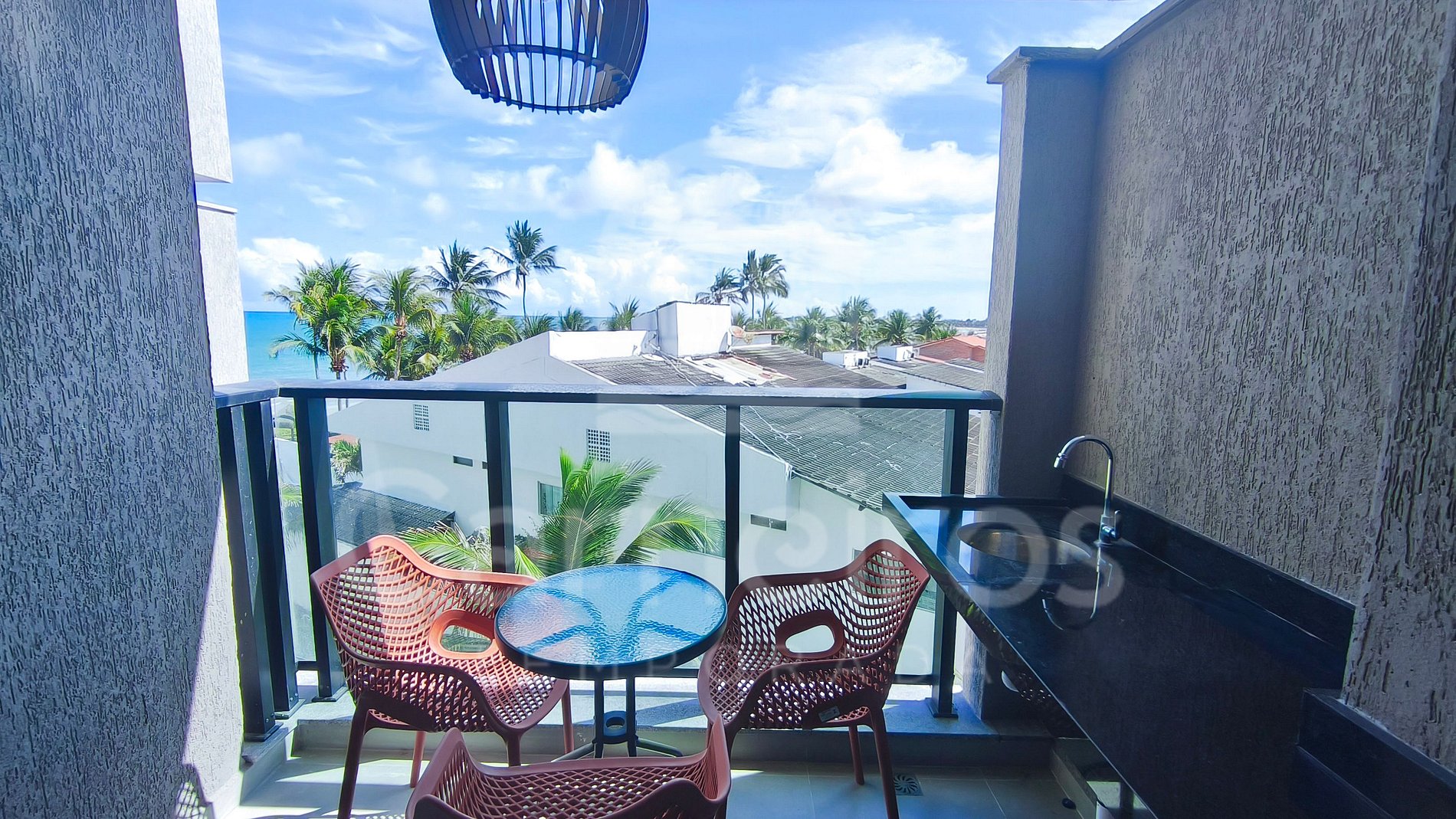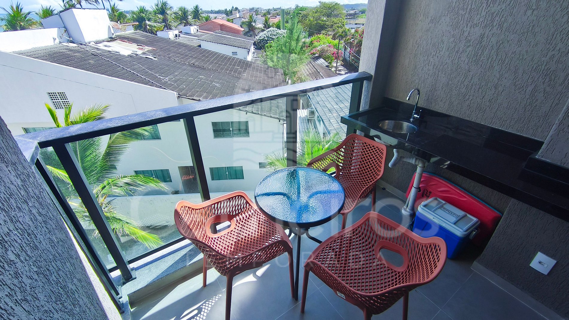 ✹ O apartamento está localizado no segundo andar, com vista para a piscina e vista lateral para o mar. Possui uma aconchegante varanda mobiliada com mesa e cadeiras, ideal para momentos de descanso. ✹