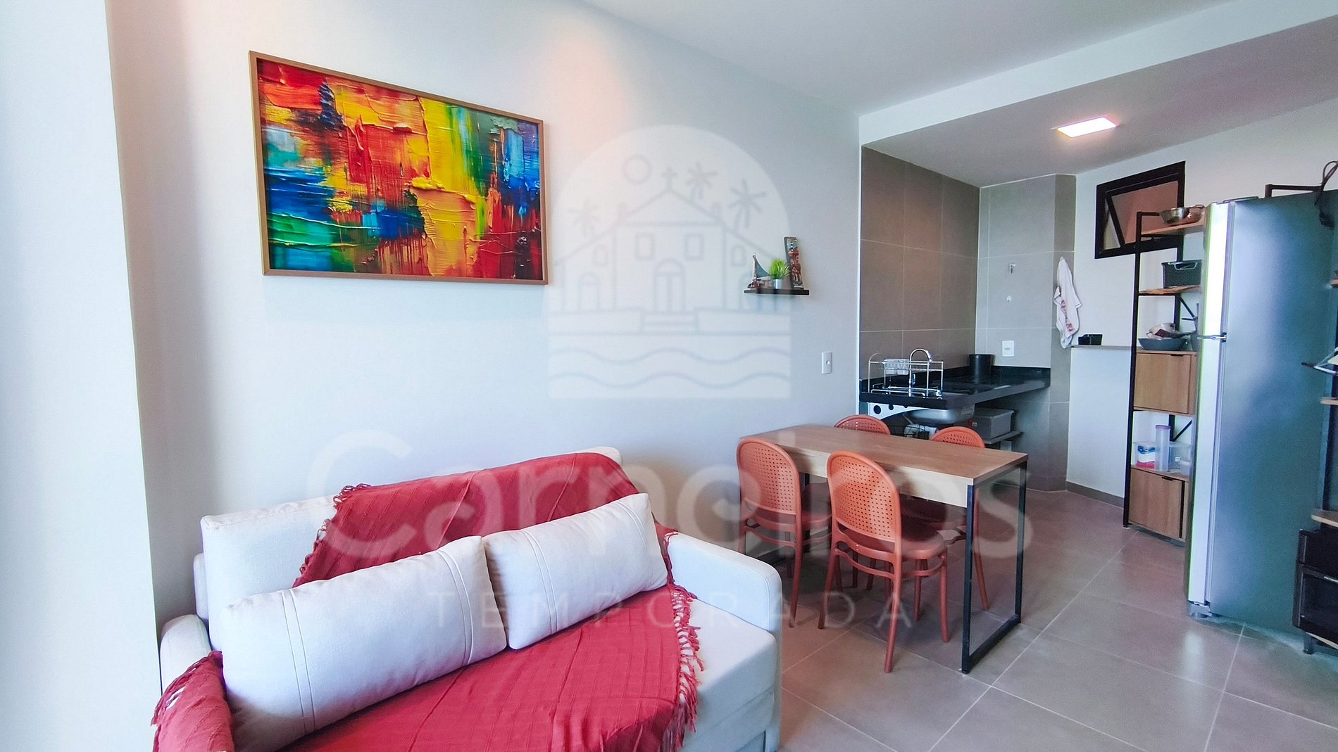 O ambiente é integrado e conta com decoração acolhedora. O apartamento dispõe de varanda, quarto, cozinha e banheiro. A cozinha é equipada com geladeira, airfryer, liquidificador e diversos utensílios. O imóvel oferece TV, ar-condicionado no quarto e sala e banheiro completo. A varanda de frente para a piscina possui mesa para até 4 lugares.