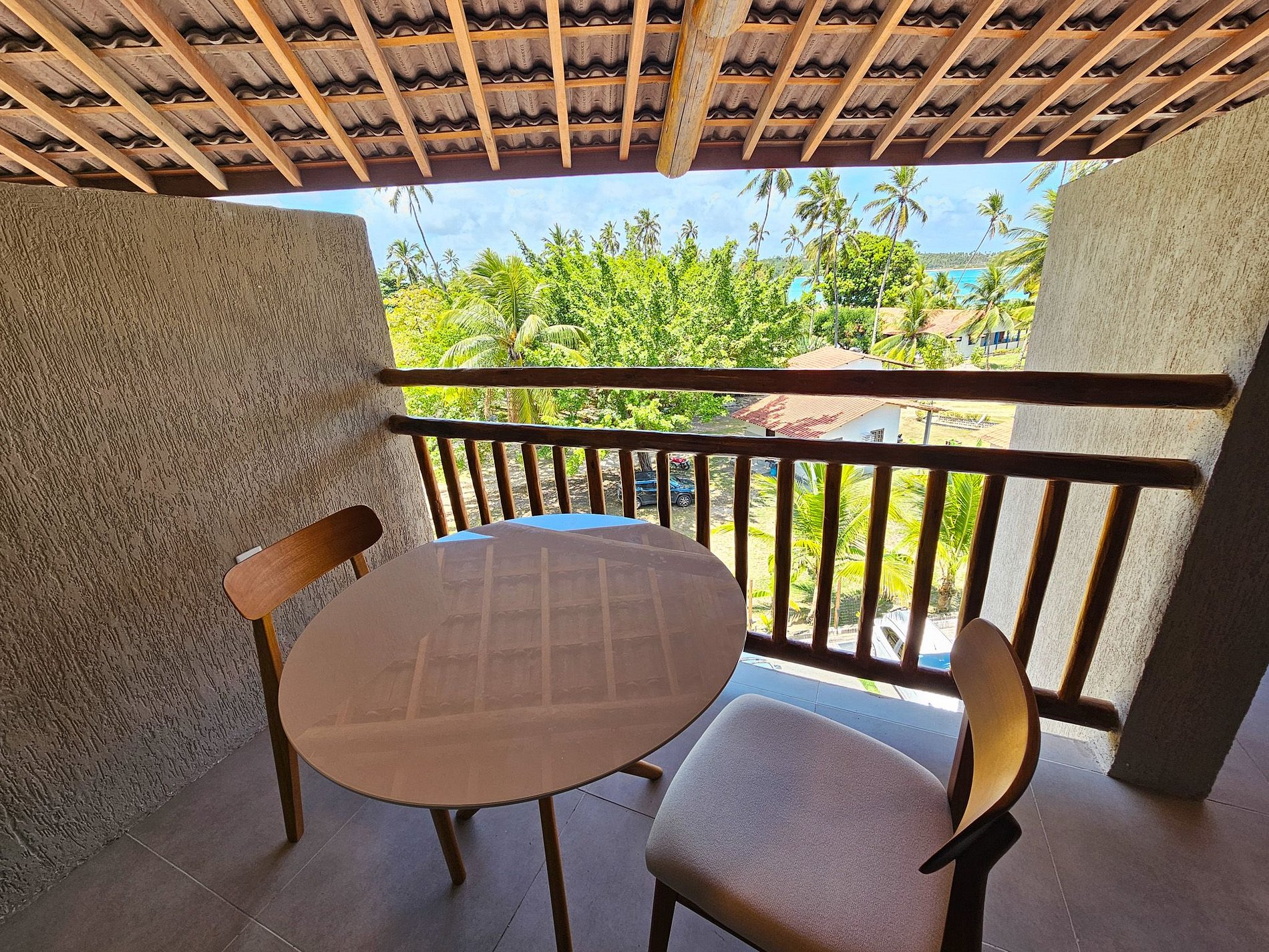 Varanda - Varanda privativa mobiliada com mesa e cadeiras, oferecendo vista para os coqueiros e o mar ao fundo.