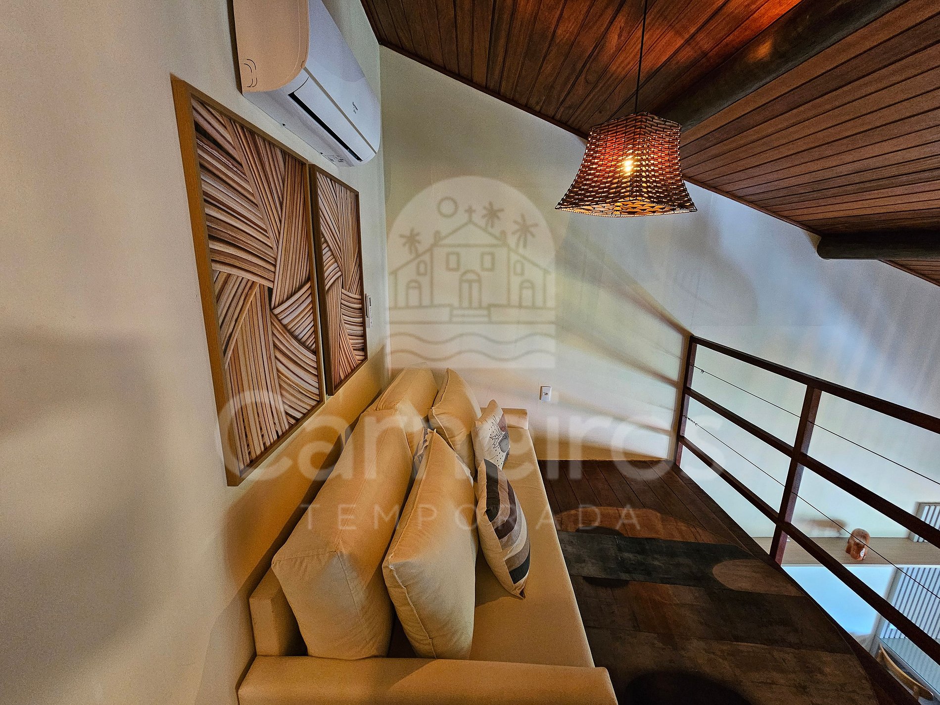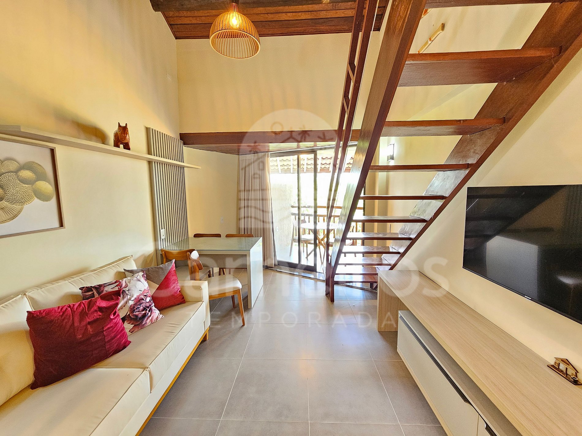 O ambiente possui decoração aconchegante e moderna com configuração em dois andares. A cozinha é completa com louças e talheres, copos, geladeira, fogão cooktop, micro-ondas, airfryer, cafeteira elétrica, entre outros utensílios. O imóvel ainda conta com TV, lavanderia, armários, internet, ar-condicionado e 2 banheiros completos.